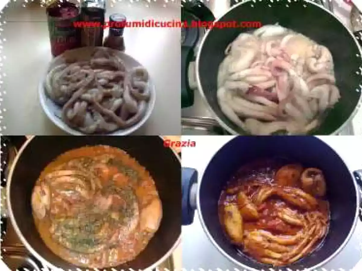 - Puliamo i polpi e laviamoli bene. La ricetta prevede di usare un tegame di coccio ma, essendone sprovvista di uno grande, mi sono arrangiata con un tegame normale.