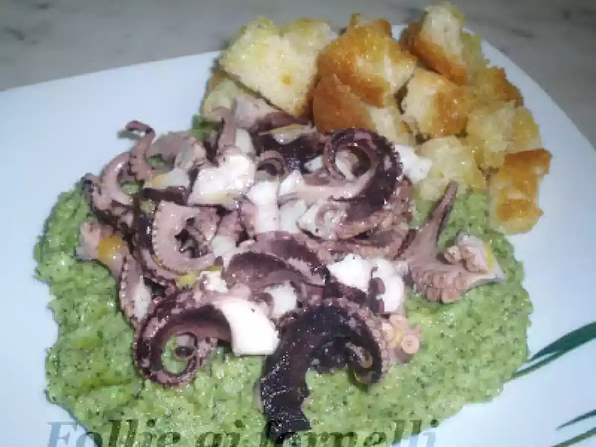Polpo con pane croccante su crema di broccoli siciliani Portata principalefacile55 min Invia questa ricetta ad un amico Stampa la ricetta Contatta l'autore della Ricetta Pubblica la foto di questa ricetta Ingredienti 5 1,5 kg di polpo decongelato 2 broccoli siciliani 4 fette di pane raffermo 2 filetti di acciuga 2 costole di sedano 1 carota 1 cipolla 1 peperoncino fresco 1 tazzina di aceto di vino Scorza di limone Sale Pepe Olio extravergine di oliva