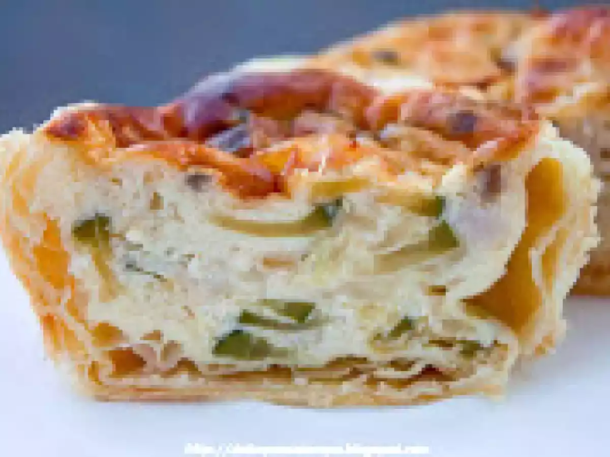 Quiche di pasta sfoglia alle zucchine PrecedenteProssimo Portata principalefacile48 min95149 Kcal Invia questa ricetta ad un amico Stampa la ricetta Contatta l'autore della Ricetta Pubblica la foto di questa ricetta Ingredienti 2 1 rotolo di pasta sfoglia 150 di scamorza 150 di panna 2 uova 4 zucchine 100 g di pancetta a dadini Sale Pepe Scalogno Erba cipollina 2 cucchiaia di grana Costo stimato: 236.27Euros€ (118.14€/Porzioni)