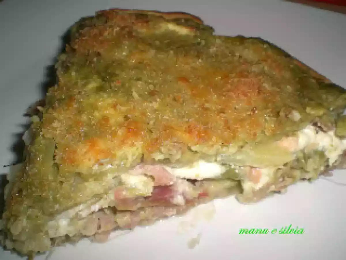 Quiche morbida di patate e pesto di fagiolini Portata principalefacile1 h 10 m Invia questa ricetta ad un amico Stampa la ricetta Contatta l'autore della Ricetta Pubblica la foto di questa ricetta Ingredienti 4 pasta frolla 500 g fagiolini verdi 3 patate 160 g speck a fette 250 g stracciatella 25 g formaggio ubriaco al vino rosso 1 spicchio aglio olio evo menta pane grattugiato sale