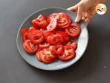 Ora adagiate le fette di pomodoro sulla base (conservate le fette migliori per la parte superiore) e cospargere i pomodori con la feta sbriciolata. Poi versate nella tortiera il composto latte/uova e ultimate con le fette di pomodoro che avete conservato