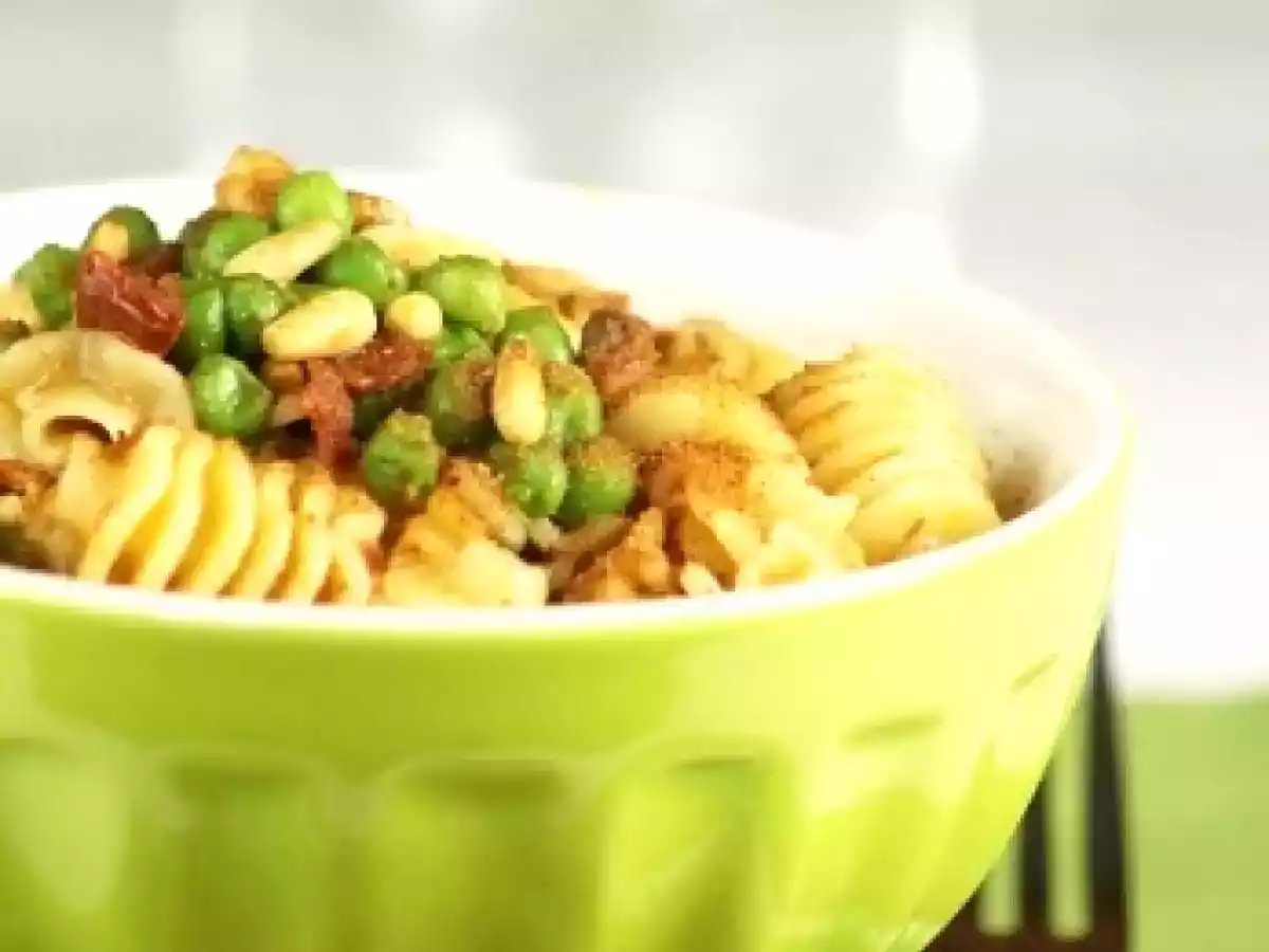Radiatori al pesto di pomodori secchi, piselli e bottarga