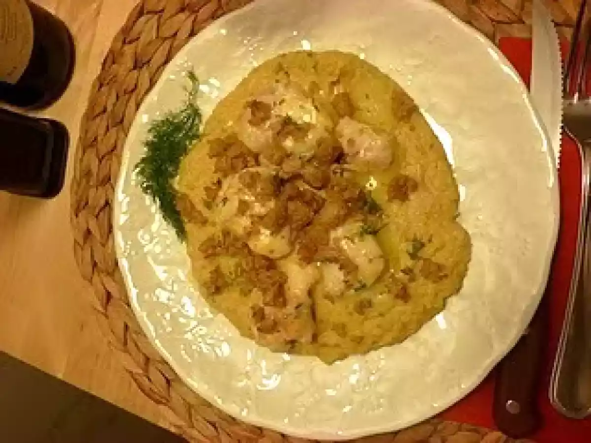Rana pescatrice panata al finocchietto su vellutata di cicerchie PrecedenteProssimo Portata principaleDifficile1 ora Invia questa ricetta ad un amico Stampa la ricetta Contatta l'autore della Ricetta Pubblica la foto di questa ricetta Ingredienti 8 2 filetti rana pescatrice 200 gr. cicerchie secche sedano carota cipolla olio extra vergine d'oliva salvia rosmarino sale pepe mollica di pane finocchietto selvatico vino bianco timo