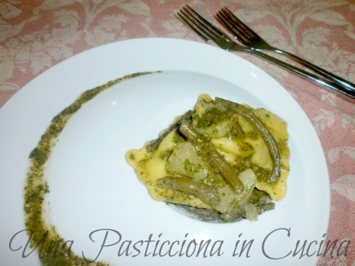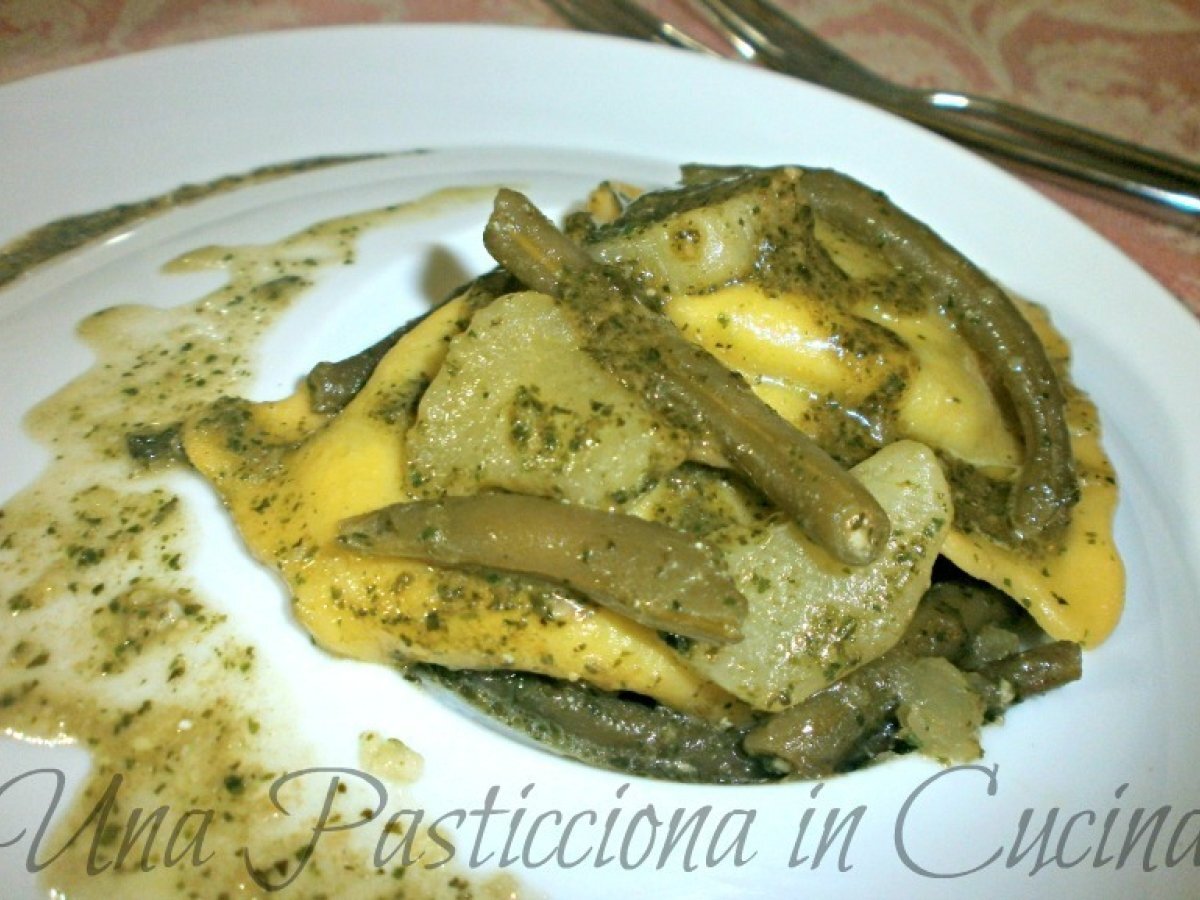 Ravioli al pesto con patate e fagiolini PrecedenteProssimo Portata principalefacile20 min367 Kcal Invia questa ricetta ad un amico Stampa la ricetta Contatta l'autore della Ricetta Pubblica la foto di questa ricetta un primo piatto fresco Ingredienti 4 400 g di Granraviolo con spinaci e ricotta 4 patate sbucciate, lavate e tagliate a fette 300 g di fagiolini già puliti e tagliati in due parti Per il pesto di basilico : 3 manciate di basilico lavato ed asciugato 2 cucchiai di parmigiano reggiano grattugiato 2 cucchiai di pecorino toscano grattugiato 50 g di pinoli 1 spicchio d’aglio q. b. di olio extravergine d’oliva 1 cucchiaino di sale Costo stimato: 7.41Euros€ (1.85€/Porzioni)