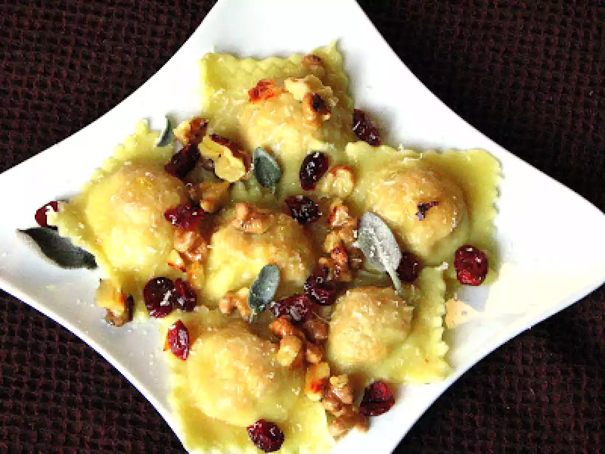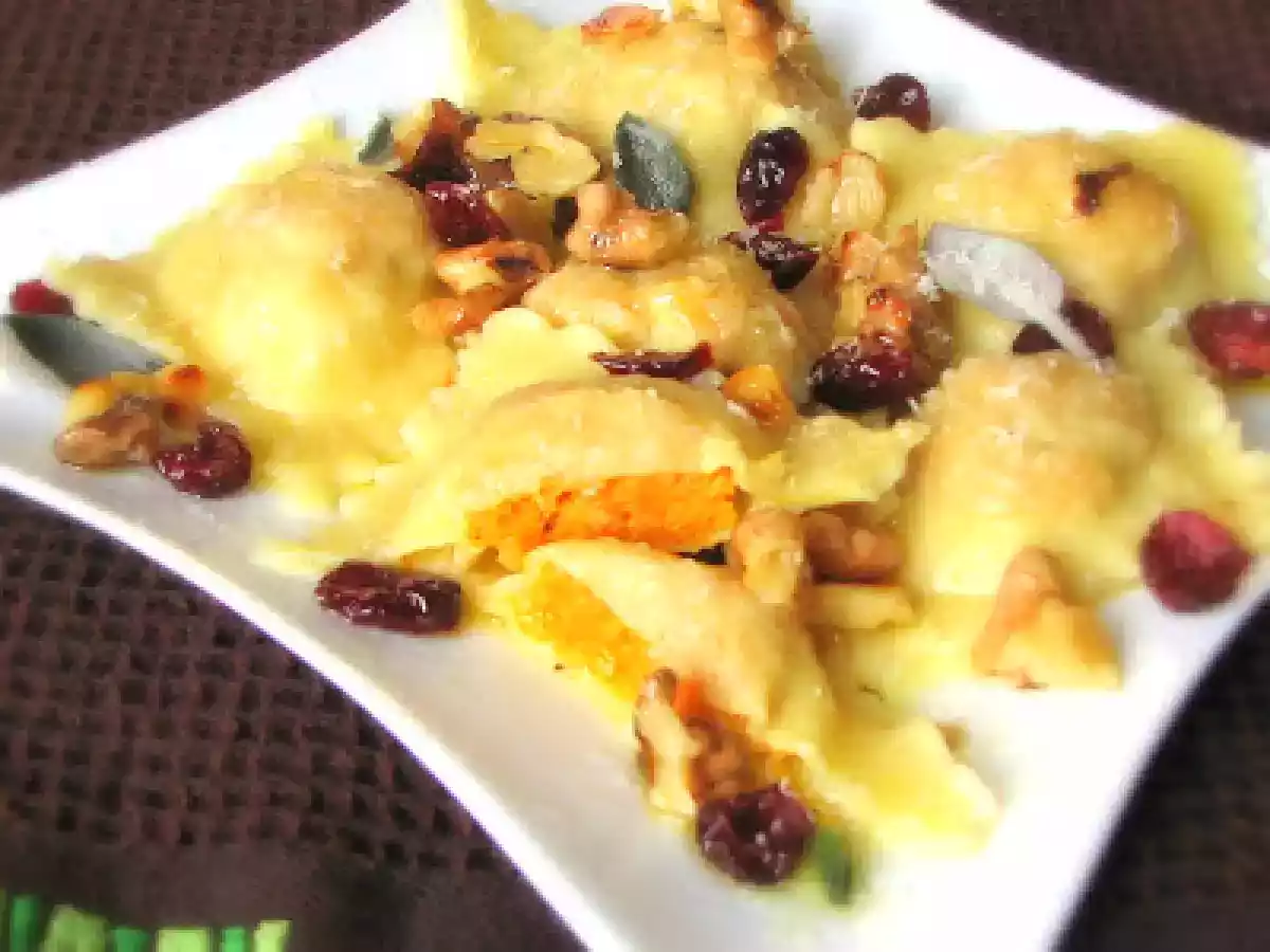 Ravioli alla zucca con mirtilli rossi e noci...e ricordi autunnali vota adesso PrecedenteProssimo Portata principalefacile1 h 20 m Invia questa ricetta ad un amico Stampa la ricetta Contatta l'autore della Ricetta Pubblica la foto di questa ricetta Ingredienti 2 per la pasta 200 g farina 00 100 g semola di grano duro rimacinata 3 uova sale per il ripieno una zucca gialla di quelle lunghe salvia timo rosmarino finocchietto secchi Mondospezie 1 uovo 100 g parmigiano grattuggiato un pizzico di noce moscata Mondospezie un pizzico di pimento macinato Mondospezie la scorza grattuggiata di un limone sale e pepe pane grattuggiato quanto serve per asciugare l'impasto per il condimento Burro q.b. qualche foglia di salvia gherigli di noci q. b. mirtilli secchi q. b. parmigiano grattuggiato q. b.