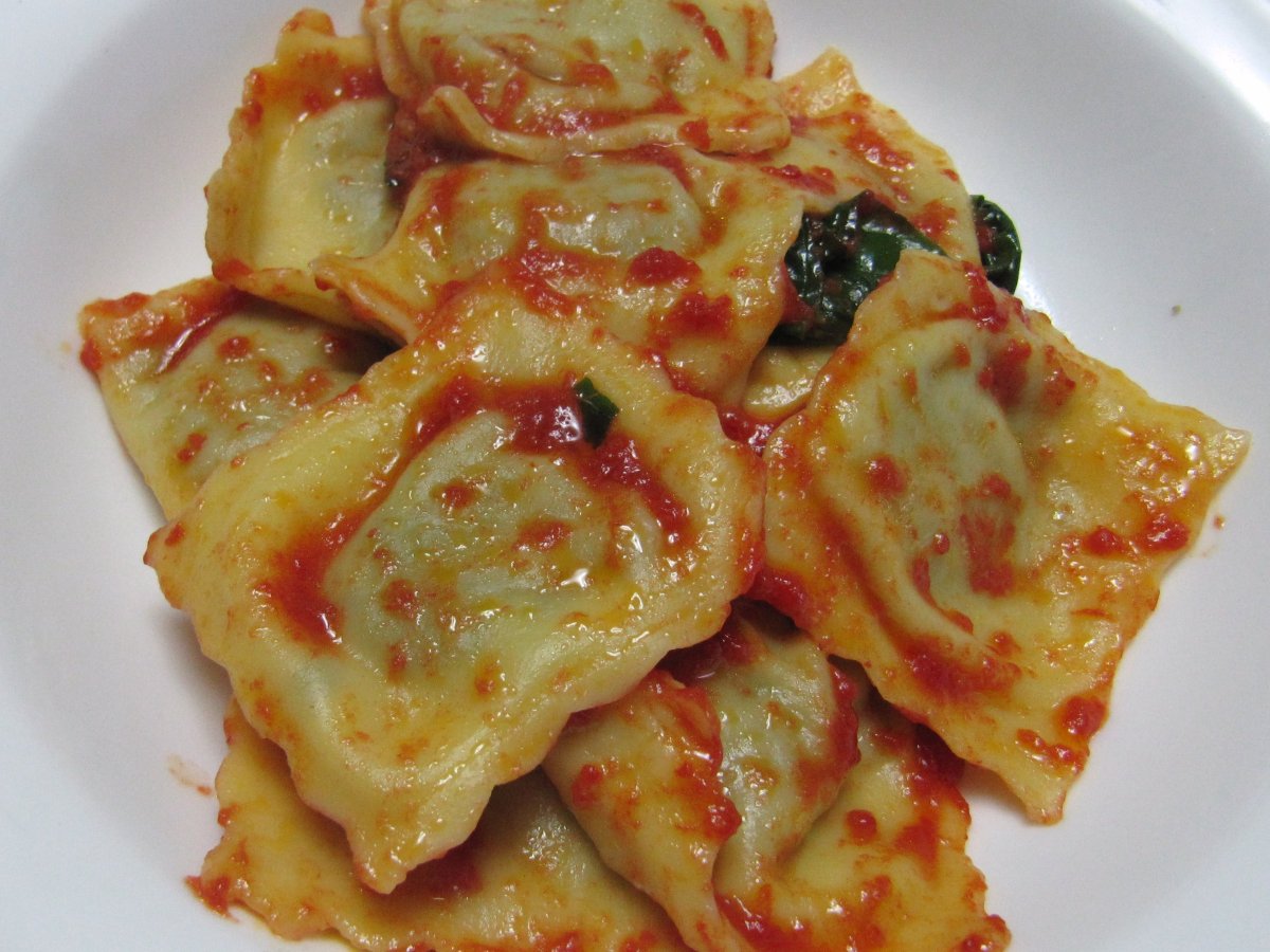 Dei ravioli ripieni di macinato, salsiccia, prosciutto crudo, bietola, parmigiano grattugiato e serviti con una semplice salsa di pomodoro e basilico.