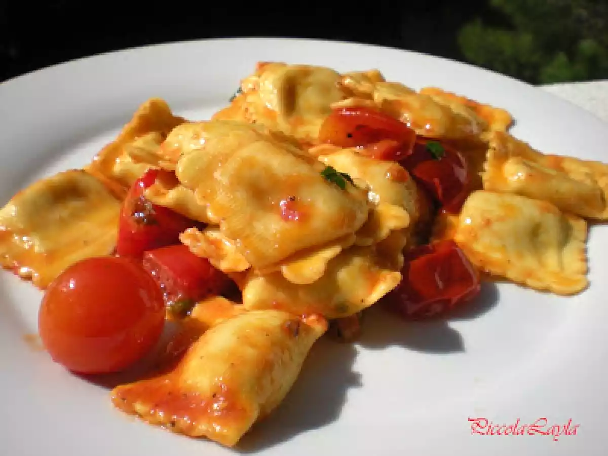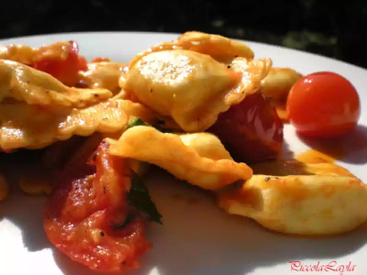 Ravioloni ai funghi con pomodorini pachino PrecedenteProssimo Portata principalefacile45 min70 Kcal Invia questa ricetta ad un amico Stampa la ricetta Contatta l'autore della Ricetta Pubblica la foto di questa ricetta Ingredienti 4 500g di ravioli ai funghi freschi 2 grappoli di pomodorini pachino 2 spicchi d aglio 1 mazzo di prezzemolo fresco sale pepe nero formaggio grattug Costo stimato: 3.6Euros€ (0.9€/Porzioni)