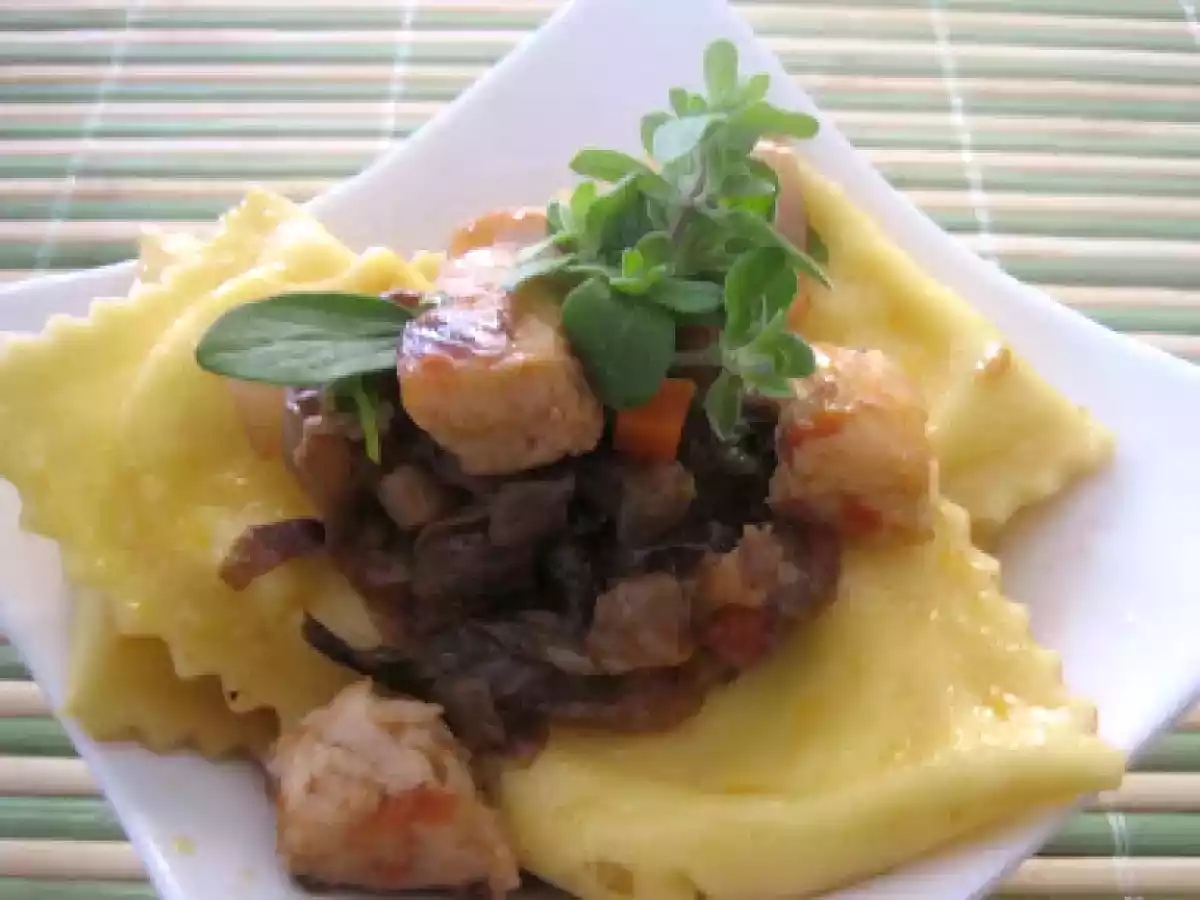 Ravioloni di ricotta al ragù di pollo ruspante vota adesso Portata principalefacile55 min Invia questa ricetta ad un amico Stampa la ricetta Contatta l'autore della Ricetta Pubblica la foto di questa ricetta Ingredienti 2 Per i ravioli 1 dose di pasta fresca all'uovo 1 cestino di ricotta di mucca da 400 g comprata il giorno prima e tenuta a scolare del siero in eccesso 2 cucchiai di formaggio romano grattugiato 1 cucchiaio di parmigiano reggiano grattugiato un pizzico di noce moscata 1 tuorlo sale pepe Per il ragù al radicchio 1/4 di petto di pollo ruspante 1 radicchio rosso di Treviso 1 scalogno piccolo 1/2 carota poco sedano qualche rametto di prezzemolo 1 rametto di maggiorana 70 g di olio evo uno schizzo di vino bianco 2 cucchiai di polpa di pomodoro 1 cucchiaino di dado home-made o 1 mestolo di brodo parmigiano per condire sale e pepe
