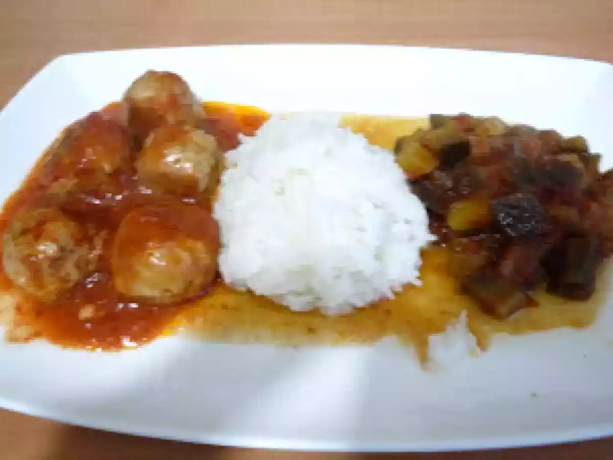 Riso basmati con polpettine di carne e melanzane al pomodoro Portata principalefacile55 min932 Kcal Invia questa ricetta ad un amico Stampa la ricetta Contatta l'autore della Ricetta Pubblica la foto di questa ricetta Ingredienti 2 100 g di riso basmati Per le polpette 200 g di macinato di vitello mollica di pane bagnata nel latte sale pepe misto di erbe aromatiche olio extravergine di oliva 150 ml di passata di pomodoro farina Per le melanzane 1 melanzana 1/2 cipolla 150 ml di passata di pomodoro sale olio extravergine di oliva