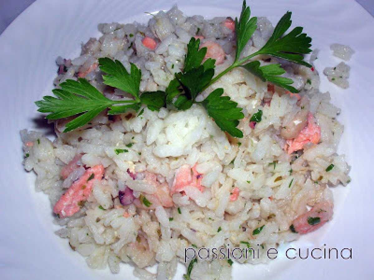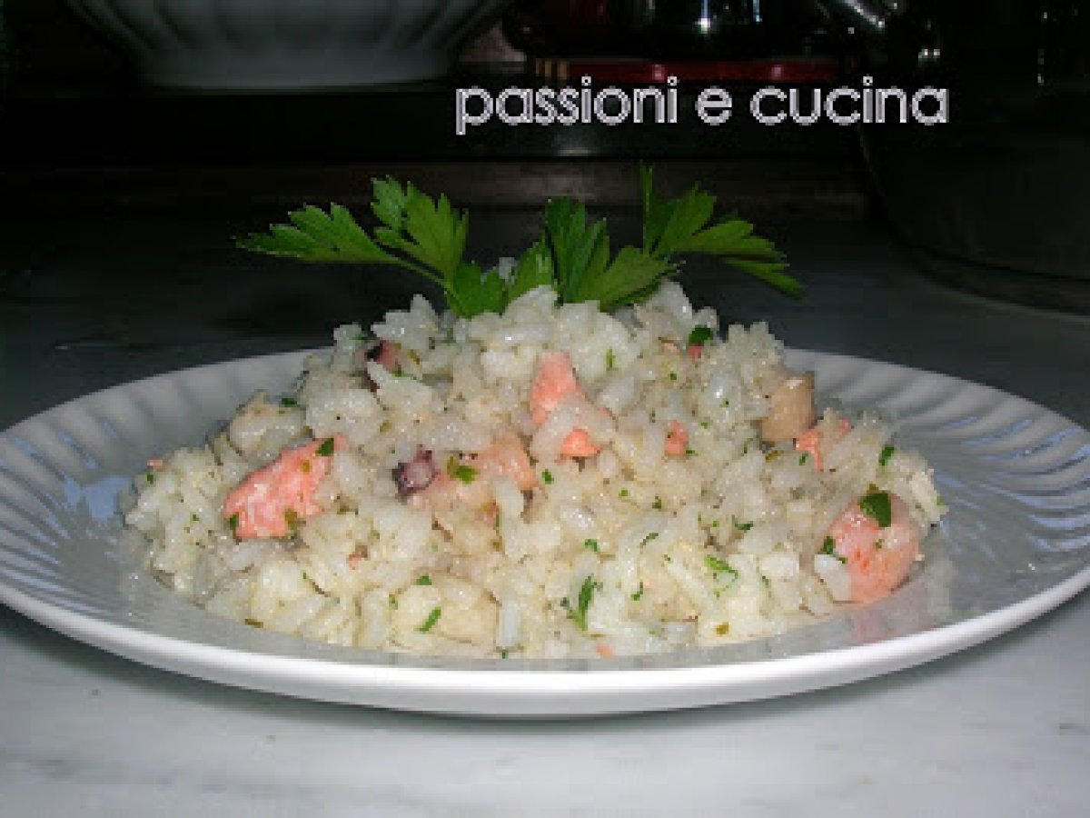 Riso freddo al pesce PrecedenteProssimo Portata principalefacile45 min Invia questa ricetta ad un amico Stampa la ricetta Contatta l'autore della Ricetta Pubblica la foto di questa ricetta Ingredienti 2 1 bicchiere e mezzo di riso olio extravergine di oliva 1 spicchio d'aglio 1 peperoncino 1 mazzetto di prezzemolo tritato 1 filetto di salmone 1 filetto di platessa 2 seppie 1 manciata di gamberetti rosmarino sale poco succo di limone