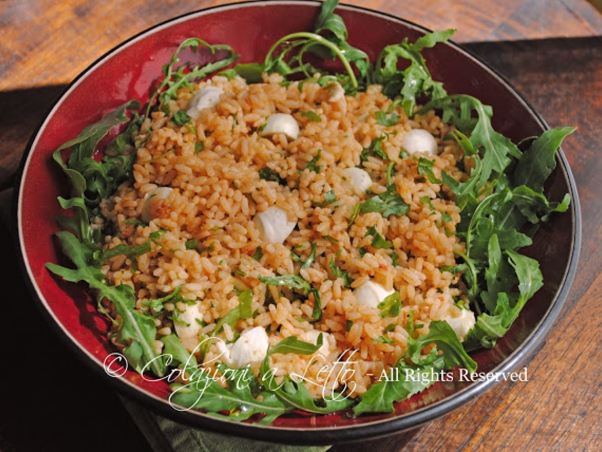 Riso freddo con pesto rosso, mozzarelline e rucola e "au revoir" a settembre Portata principalefacile50 min Invia questa ricetta ad un amico Stampa la ricetta Contatta l'autore della Ricetta Pubblica la foto di questa ricetta Ingredienti 3 riso parboiled 300 gr pomodori secchi 8 pezzi capperi dissalati 1 cucchiaino parmigiano reggiano 2 cucchiai mandorle pelate 30 gr mozzarelline a ciliegia 100 gr succo di 1/2 limone rucola un paio di manciate olio extravergine di oliva 8 cucchiai