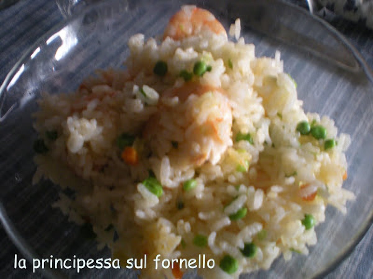 Riso saltato con piselli e gamberetti Portata principalefacile25 min294 Kcal Invia questa ricetta ad un amico Stampa la ricetta Contatta l'autore della Ricetta Pubblica la foto di questa ricetta Ingredienti 5 300 g di riso; 50 g di verdure miste per soffritto ; 100 g di piselli surgelati; 200 g di gamberi sgusciati; 1 spicchio d'aglio; 1 cucchiaio di olio; sale; pepe. Costo stimato: 4.58Euros€ (0.92€/Porzioni)