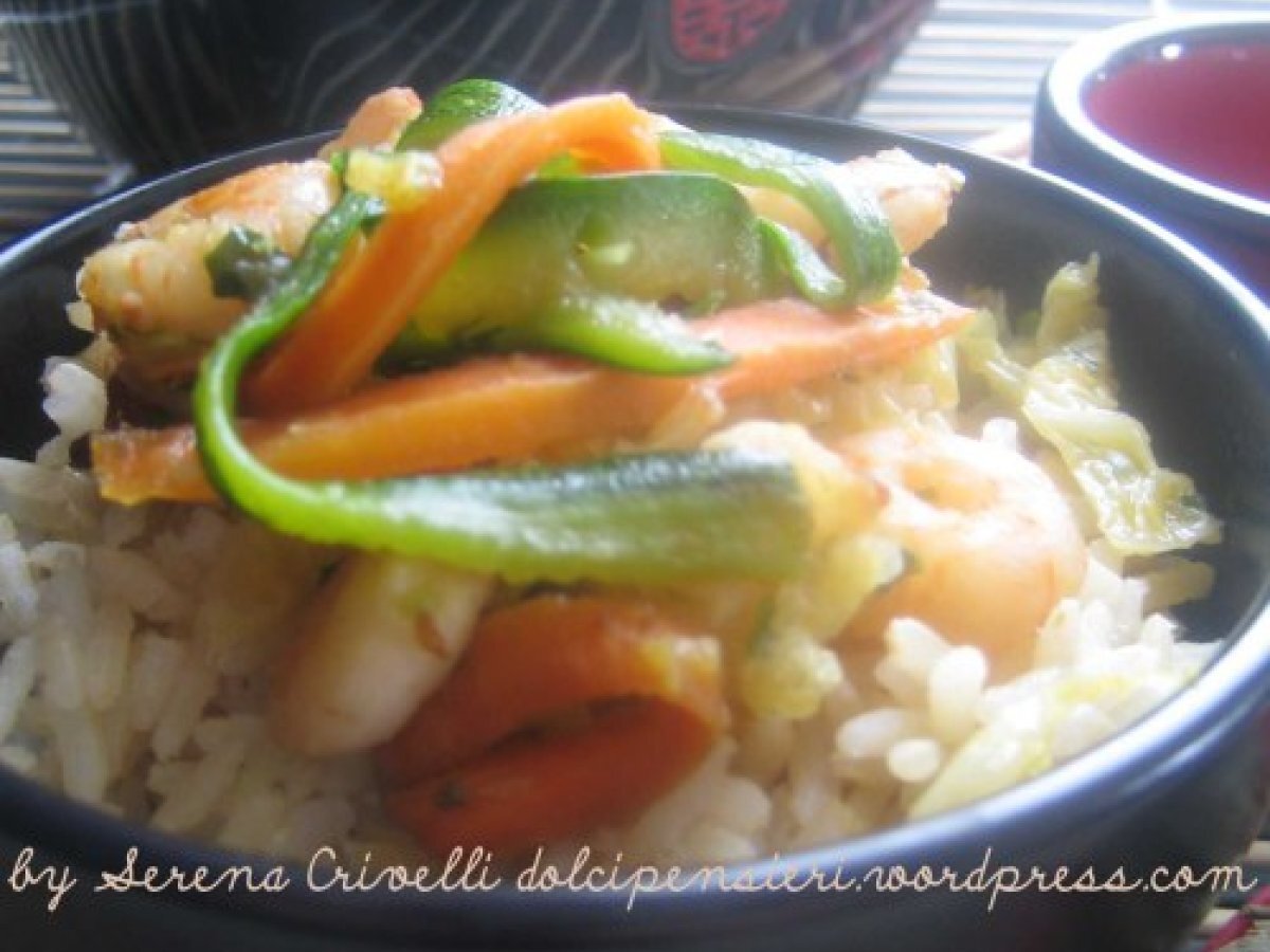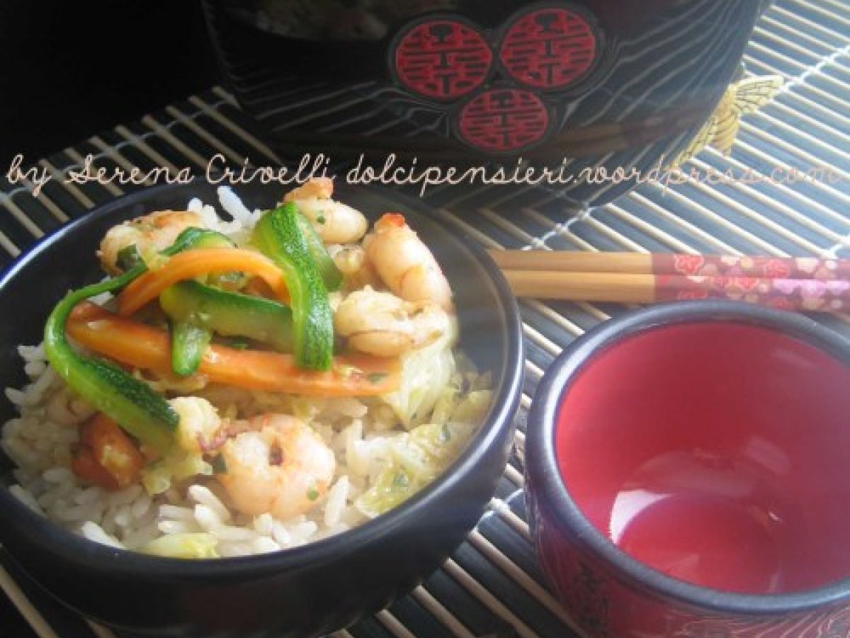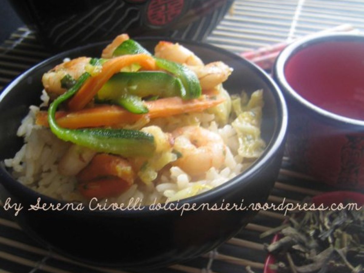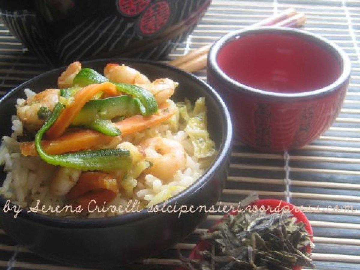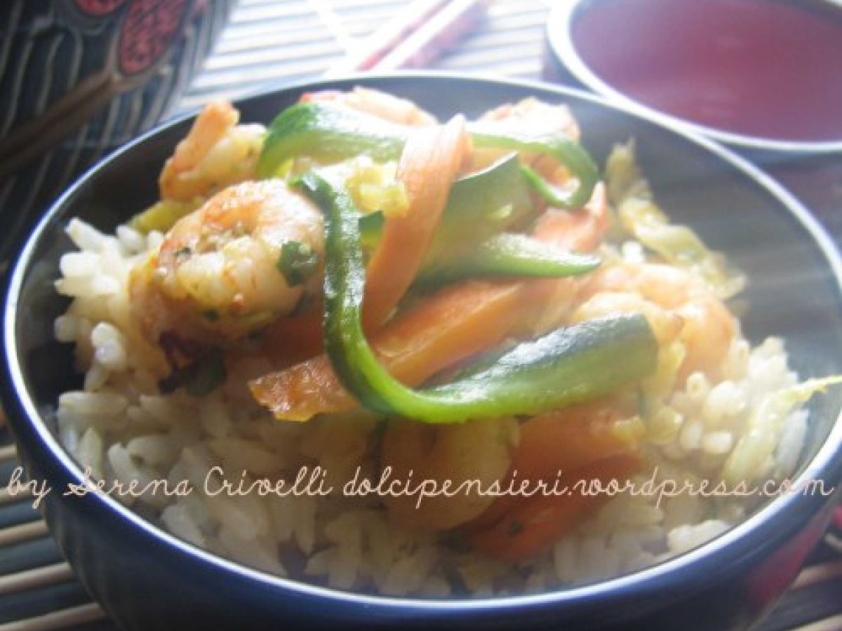 Riso thai integrale con verdure e gamberetti secondo ?dolcipensieri? PrecedenteProssimo Portata principalefacile48 min Invia questa ricetta ad un amico Stampa la ricetta Contatta l'autore della Ricetta Pubblica la foto di questa ricetta Ingredienti 3 250 g di riso thai integrale 1 zucchina 250 g di gamberetti piccoli 1 carota qualche foglia di cavolo verza qualche cucchiaio di olio di sesamo 1 cucchiaio di mix di spezie orientali 1 cucchiaio di salsa di soia