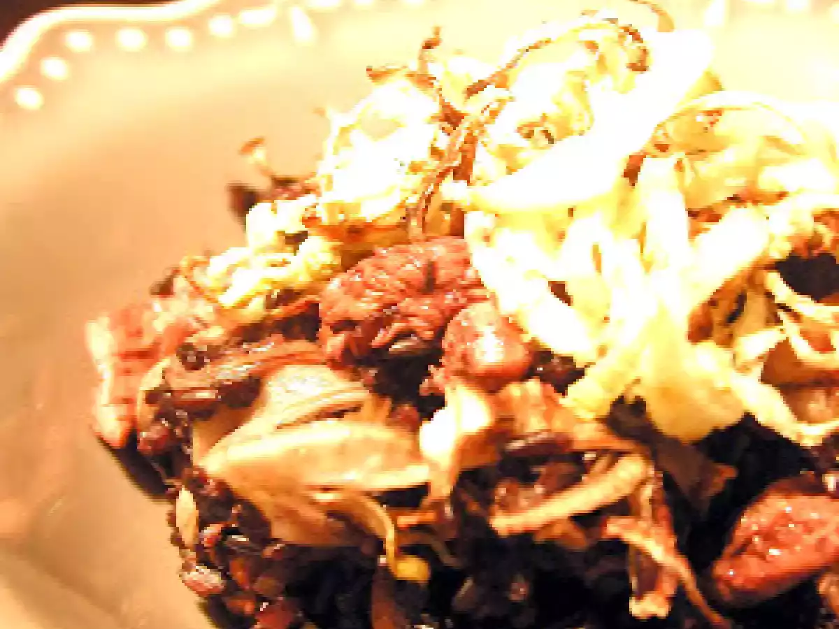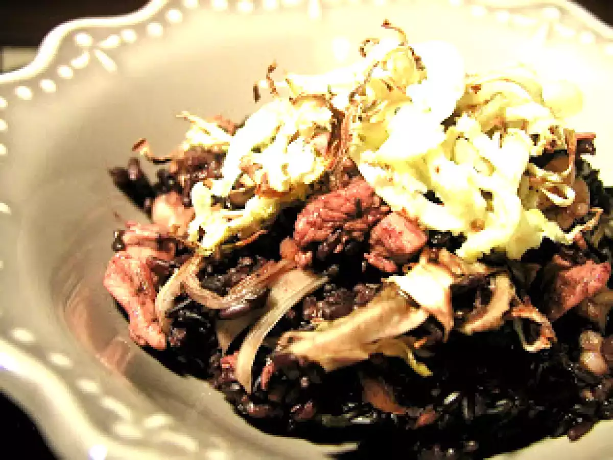 Riso venere con pollo al limone, gamberi e finocchi PrecedenteProssimo Portata principalefacile50 min Invia questa ricetta ad un amico Stampa la ricetta Contatta l'autore della Ricetta Pubblica la foto di questa ricetta Ingredienti 2 180 g riso venere 1 finocchio grande 150 g petto di pollo 8 gamberi 1 cucchiaio succo di limone buccia di 1/2 limone 2 cucchiai di salsa di soia 1/2 cucchiaio di miele di acacia erbe aromatiche 1 spicchio aglio un pizzico di zenzero sale e pepe nero, peperoncino di Cayenna olio extravergine di oliva 1 scalogno piccolo brodo vegetale per la cottura del riso