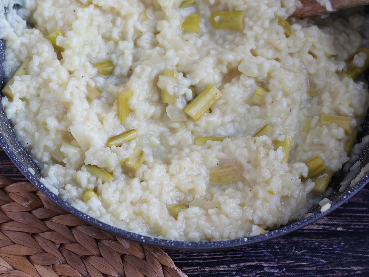Tagliate la base e sbucciate lo stelo. Recuperate le punte intere e tagliate tutto il resto a pezzetti. - Soffriggete la cipolla in padella con un filo d'olio. Aggiungete il riso e mescolate fino a quando diventerà traslucido.