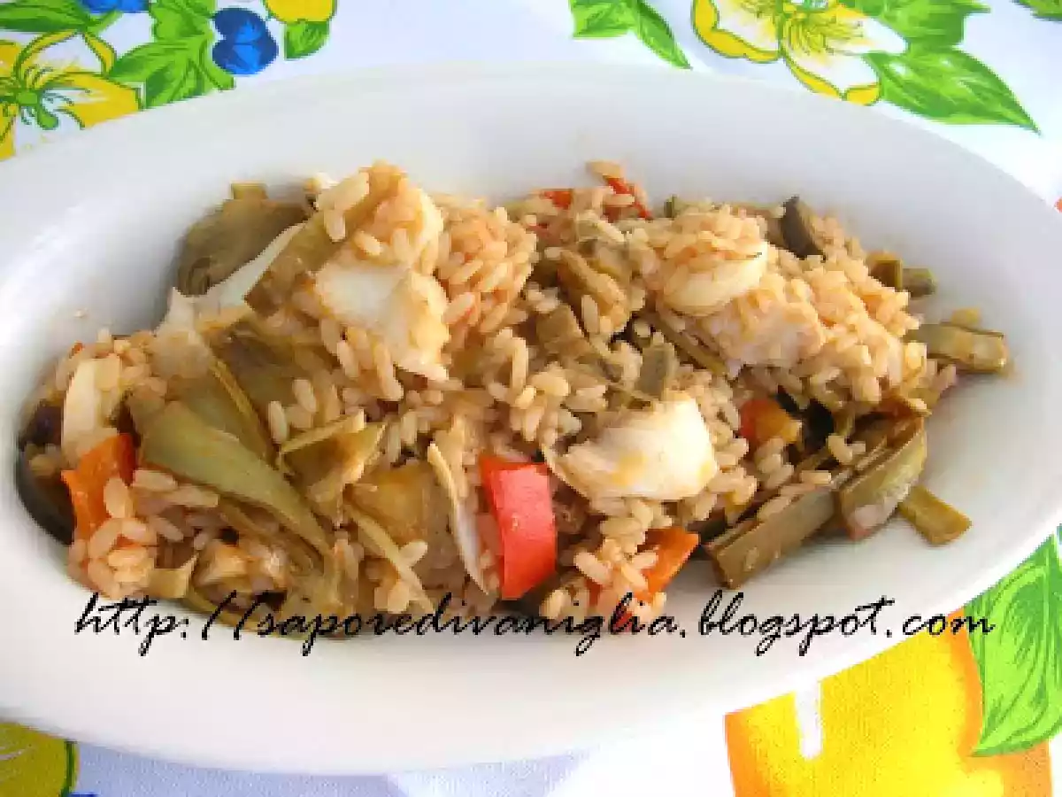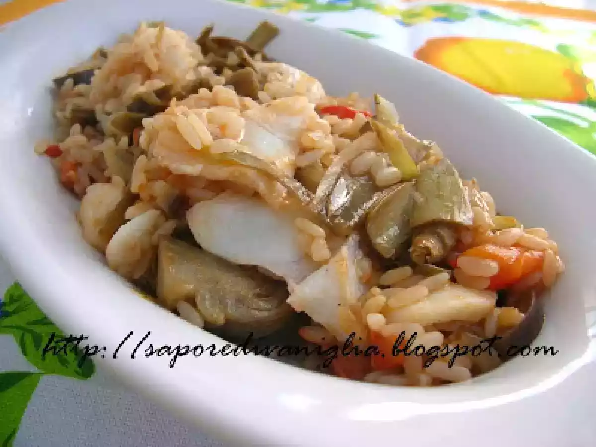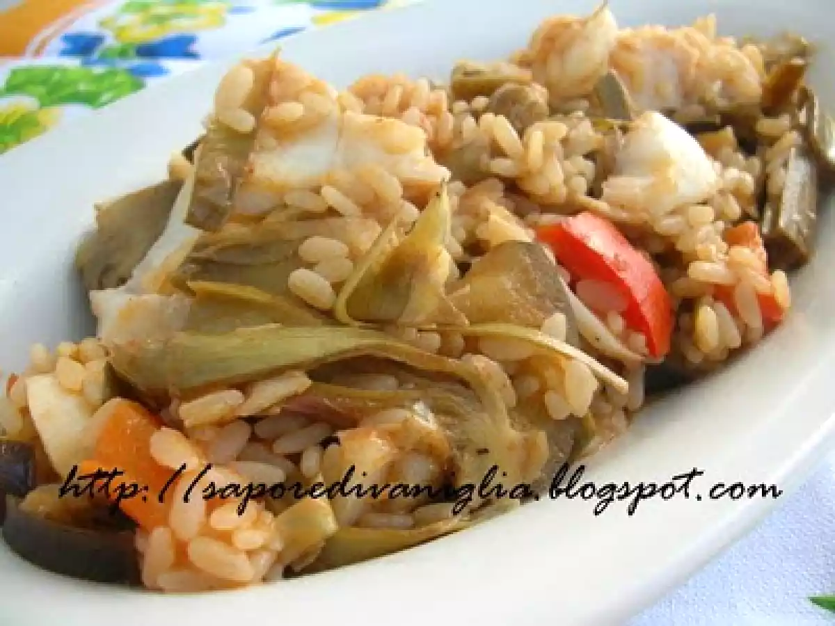 Risotto al baccalà e verdure vota adesso PrecedenteProssimo Portata principalefacile1 ora666 Kcal Invia questa ricetta ad un amico Stampa la ricetta Contatta l'autore della Ricetta Pubblica la foto di questa ricetta Ingredienti 3 300 gr. di riso per risotti 200 gr. di baccalà lessato 200 gr. di passata di pomodoro 100 gr. piselli 4 cuori di carciofo 1 peperone rosso 1 melanzana 1 carota 1 cipolla brodo di verdure olio extravergine di oliva sale e pepe qb