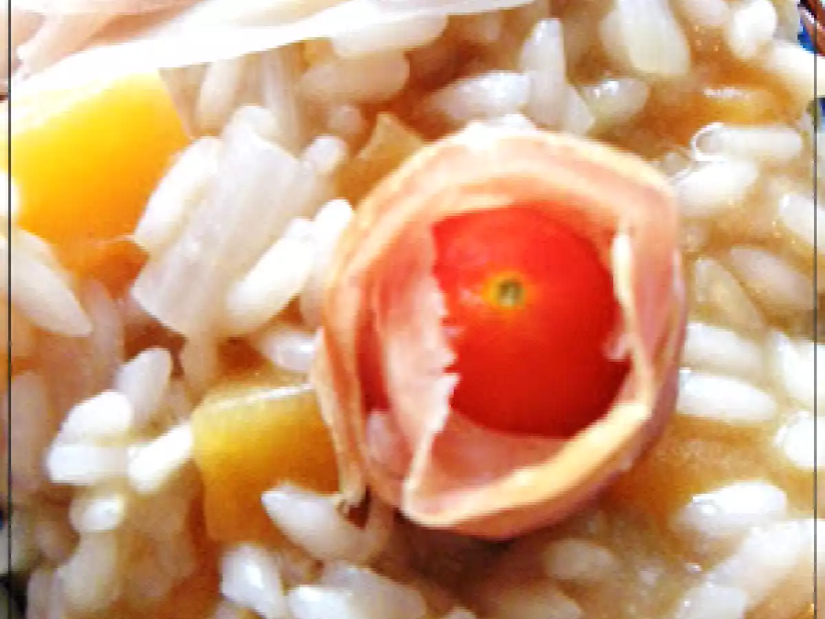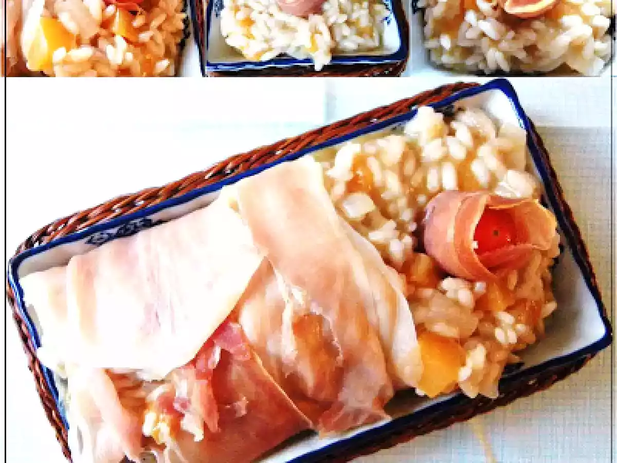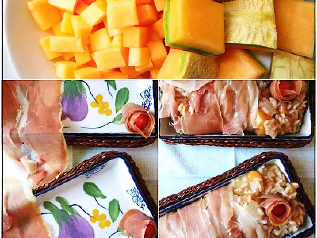 Risotto al cantalupo PrecedenteProssimo Portata principalefacile43 min Invia questa ricetta ad un amico Stampa la ricetta Contatta l'autore della Ricetta Pubblica la foto di questa ricetta Ingredienti 4 200 g di Cantalupo 200 g di Riso carnaroli 1 Cipollotto Vino bianco per sfumare 1 noce di Burro 2 cucchiai di Parmigiano grattugiato 100 g di Prosciutto crudo Olio evo Sale e Pepe Per il brodo: La buccia del Cantalupo 1 Cipolla 3 Pomodori maturi Sale, Pepe, Curry