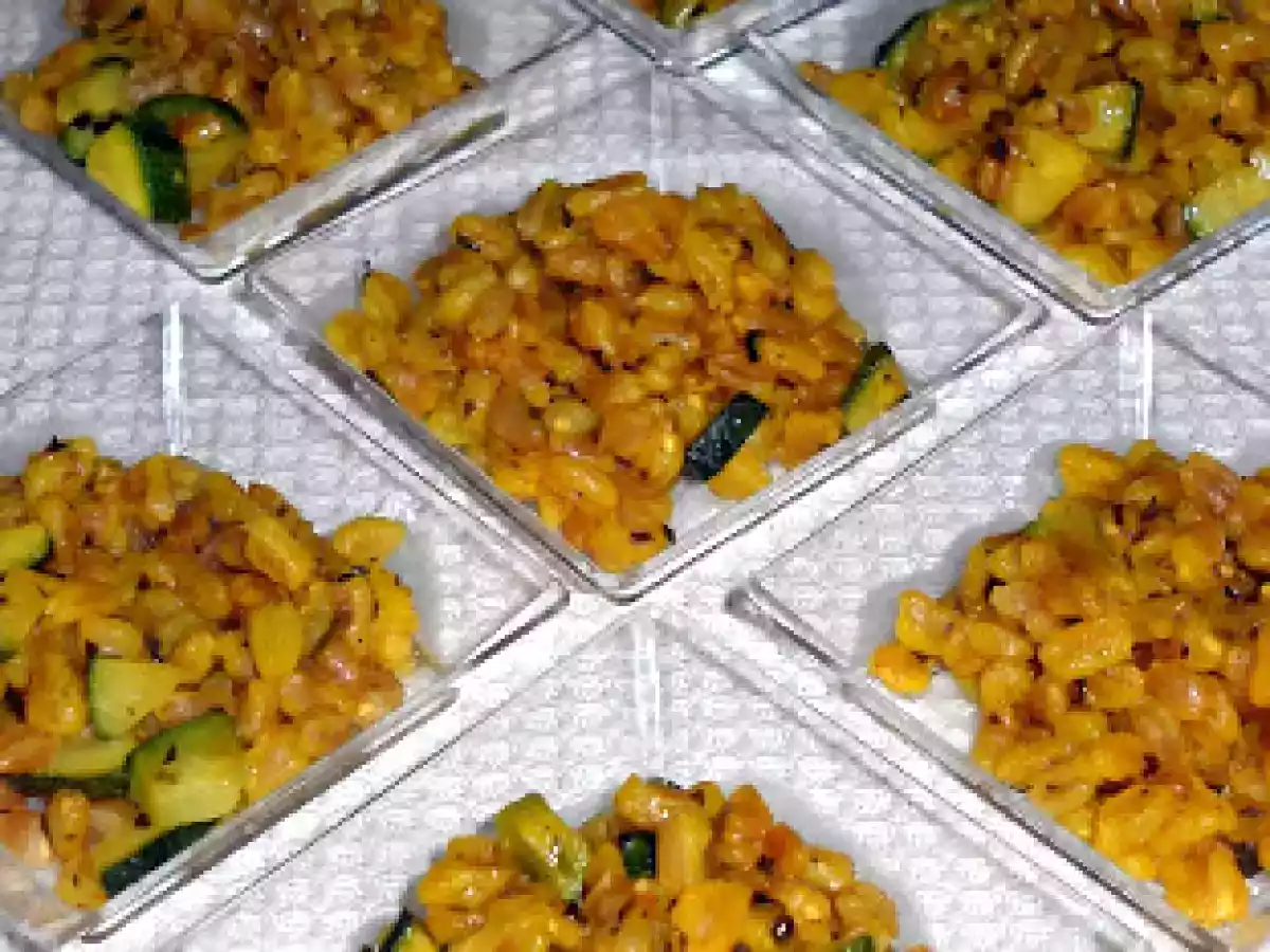 Risotto al farro con zucchine e zafferano Portata principalefacile55 min162 Kcal Invia questa ricetta ad un amico Stampa la ricetta Contatta l'autore della Ricetta Pubblica la foto di questa ricetta Ingredienti 4 250 g farro perlato 1 spicchio d'aglio 1 zucchina 1 cucchiaino basilico tritato 1 bustina zafferano olio d'oliva sale, pepe