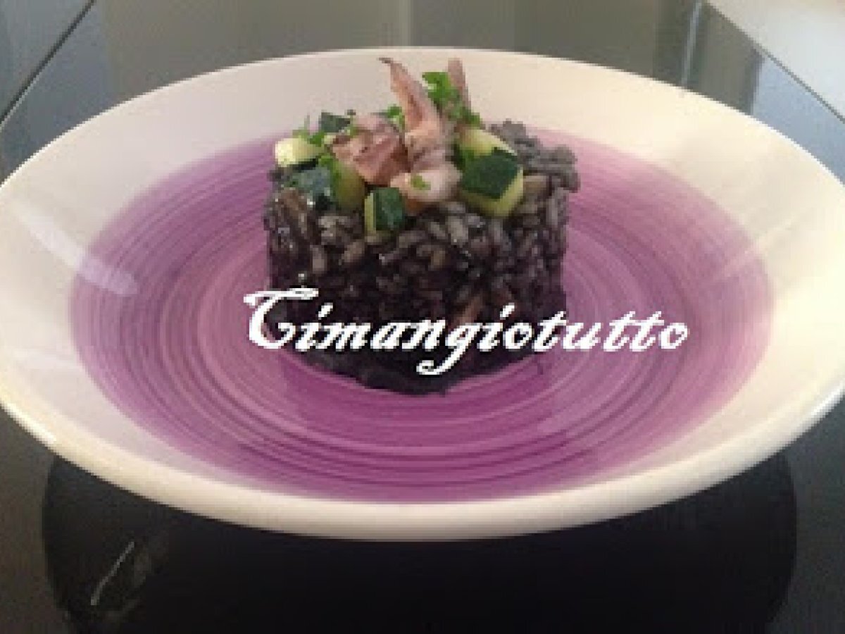 Risotto al nero di seppia condito con le seppie e le zucchine croccanti. Colori e sapore