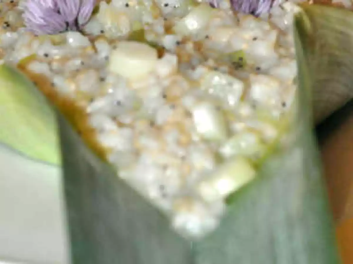 Risotto al porro e semi di papavero Portata principalemedia50 min Invia questa ricetta ad un amico Stampa la ricetta Contatta l'autore della Ricetta Pubblica la foto di questa ricetta Ingredienti 2 una tazza di riso integrale un porro grande o due medio piccoli un cucchiaio di dado vegetale (fatto in casa) due cucchiai di semi di papavero due cucchiai di olio evo acqua q.b. sale q.b. pepe q.b.