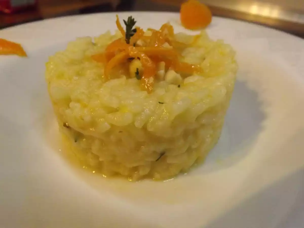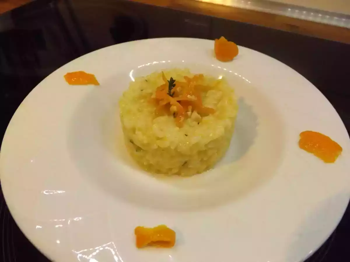Risotto al profumo d'arancia PrecedenteProssimo Portata principalemedia50 min Invia questa ricetta ad un amico Stampa la ricetta Contatta l'autore della Ricetta Pubblica la foto di questa ricetta Risotto al profumo d'arancia Ingredienti 2 Per 2 persone 160 g riso vialone nano 1/2 cipolla bianca 1 arancia non trattata 2 cucchiai di mandorle tritate 1 rametto di timo brodo vegetale qb 1/2 bicchiere vino bianco secco 2 cucchiai di parmigiano grattugiato 1 noce di burro Olio, sale e pepe