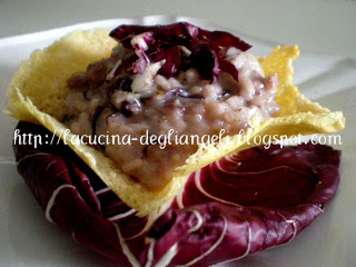Risotto al radicchio con salsiccia e gorgonzola su cialda di grana PrecedenteProssimo Portata principalefacile45 min840 Kcal Invia questa ricetta ad un amico Stampa la ricetta Contatta l'autore della Ricetta Pubblica la foto di questa ricetta Ingredienti 2 140 gr di riso 80 gr di radicchio 10 gr di burro 50 gr di gorgonzola dolce 380 gr di brodo di dado vegetale bimby 10 gr di olio extravergine di oliva 50 gr di vino bianco secco 100 gr di grana 1/2 cipolla 1 nodino di salsiccia Pepe Q.b. Costo stimato: 5.55Euros€ (2.77€/Porzioni)