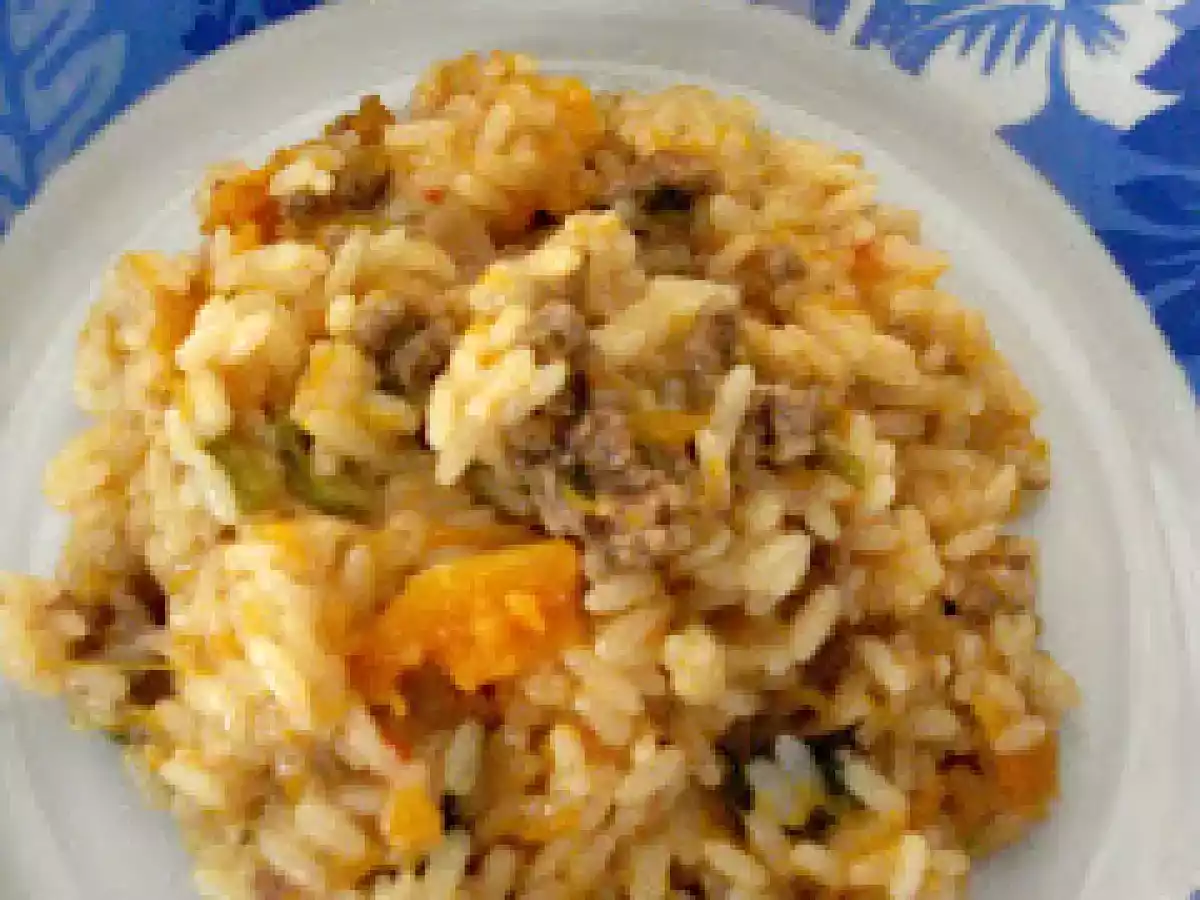 Il Risotto alla zucca rossa e macinato è un piatto principale cremoso a base di riso cotto lentamente con zucca rossa, pomodoro e macinato di vitello, insaporito con cipolla e prezzemolo. Questo risotto, arricchito con provola per un tocco filante, offre una consistenza morbida e un sapore delicato e aromatico, perfetto da gustare caldo e cremoso, magari accompagnato da un filo d'olio extravergine d'oliva.