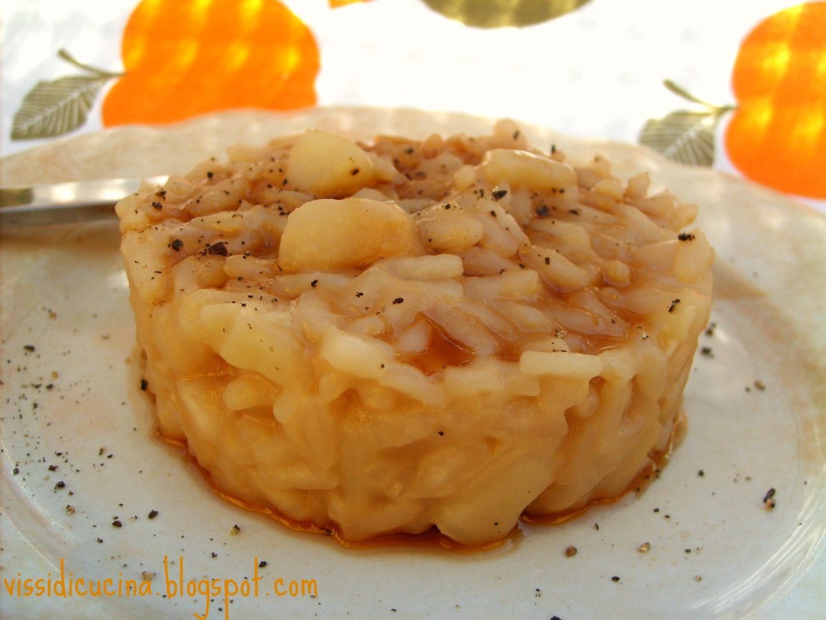Risotto alle annurche e provolone Portata principalemedia2 h 20 m Invia questa ricetta ad un amico Stampa la ricetta Contatta l'autore della Ricetta Pubblica la foto di questa ricetta Ingredienti 6 per il brodo: le bucce e i torsoli di 4 mele annurca 2 foglie di alloro mezza cipolla bianca 4 bacche di pepe nero 4 bacche di pepe rosa per il risotto: 375 g di vino dolce Zibibbo 360 g di riso Carnaroli mezza cipolla bianca 4 mele Annurca spumante brut 100 g di provolone piccante burro, olio evo sale, pepe