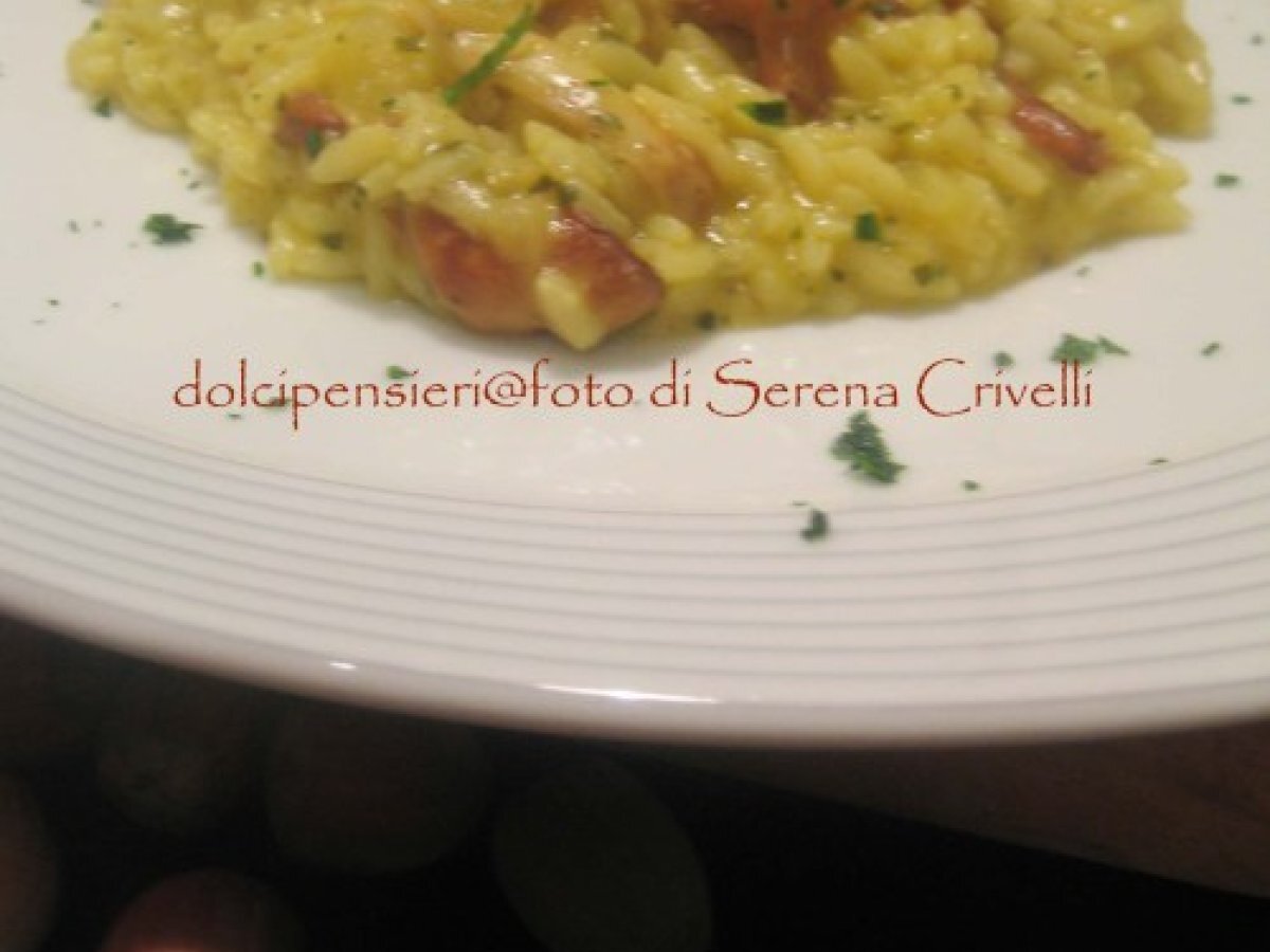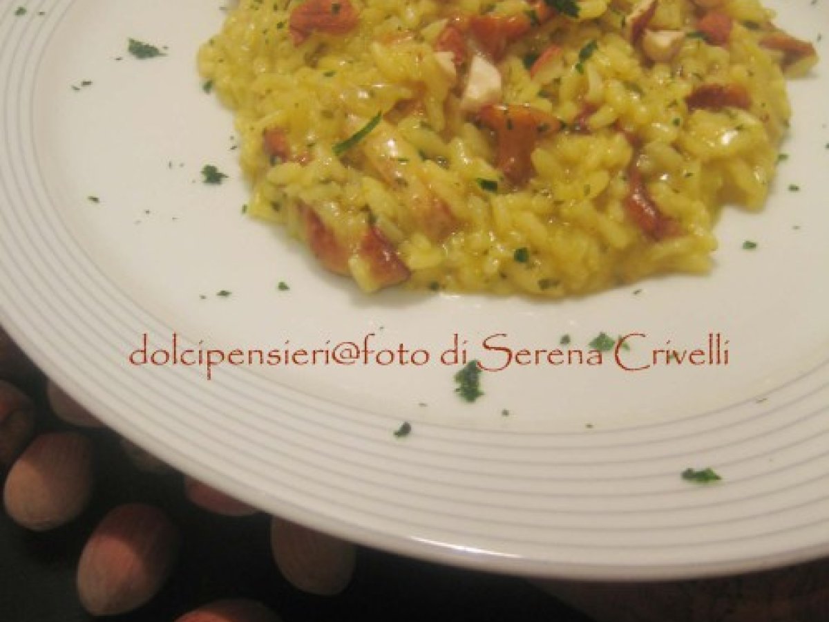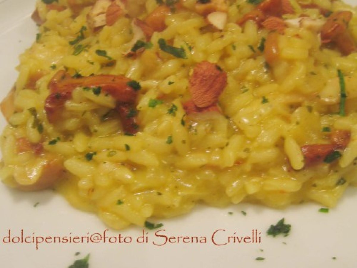 Risotto allo zafferano con finferli, porcini e nocciole di dolcipensieri vota adesso PrecedenteProssimo Portata principalefacile50 min Invia questa ricetta ad un amico Stampa la ricetta Contatta l'autore della Ricetta Pubblica la foto di questa ricetta Ingredienti 4 350 grammi di riso 1 fungo porcino medio/grande 200 grammi di funghi finferli 150 grammi di nocciole sgusciate 1 cipolla bianca pistilli di zafferano 1 bicchiere di vino bianco secco 1 litro di brodo di carne grana padano grattugiato q.b. 60 grammi di burro olio extravergine d’oliva 1 spicchio di aglio prezzemolo tritato