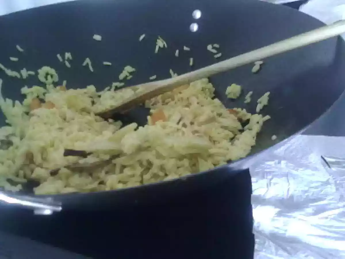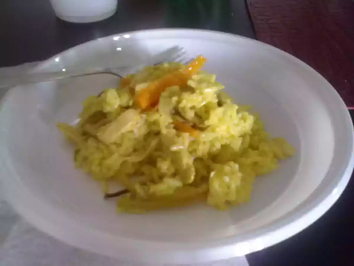 Risotto allo zafferano con verdurine croccanti e pollo al curry PrecedenteProssimo Portata principalefacile35 min913 Kcal Invia questa ricetta ad un amico Stampa la ricetta Contatta l'autore della Ricetta Pubblica la foto di questa ricetta Un risotto gustoso e facile da preparare Ingredienti 4 200 g di riso una bustina di zafferano 2 carote 1 gambo di sedano 5 funghi champignon 2 fettine di pollo curry sale Costo stimato: 12.61Euros€ (3.15€/Porzioni)