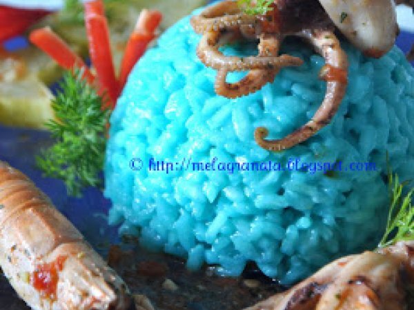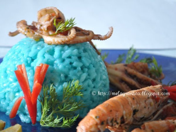 Risotto blu... dipinto di blu ! PrecedenteProssimo Portata principalefacile45 min Invia questa ricetta ad un amico Stampa la ricetta Contatta l'autore della Ricetta Pubblica la foto di questa ricetta Ingredienti 3 1) per il riso : 300 g riso carnaroli scalogno olio evo 1 bicchiere di vino bianco secco brodo blu di metilene 2) per la zuppetta : gamberi scampi moscardini prezzemolo aglio vino bianco secco peperoncino carambola polpa di pomodoro 3) per decorare : aneto peperoncini rossi freschi
