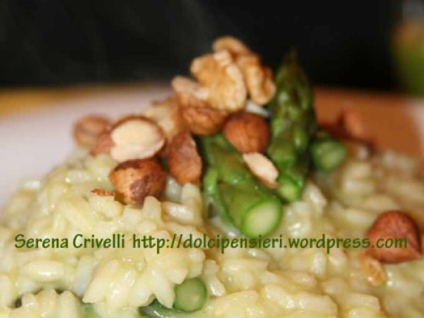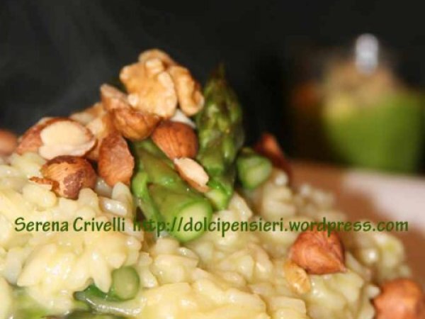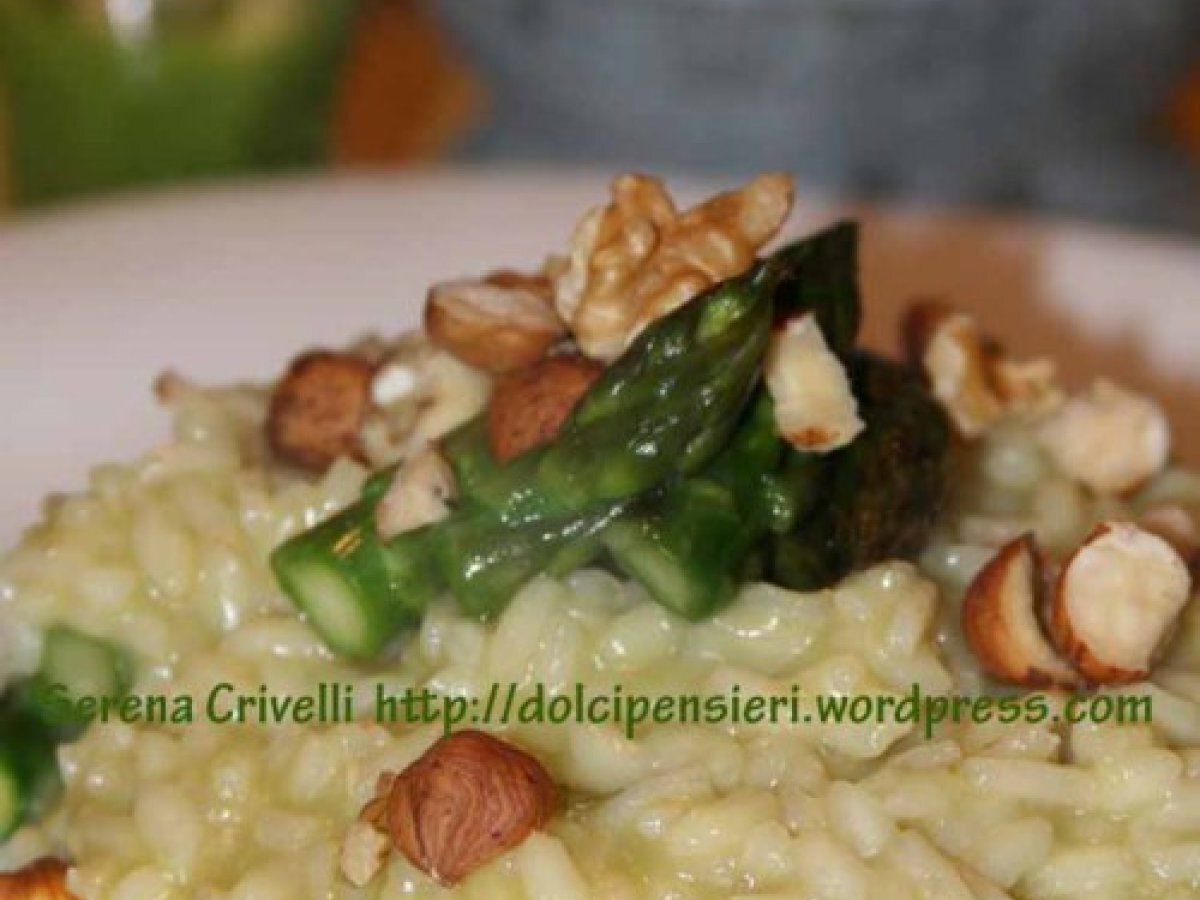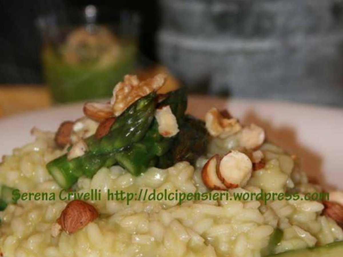 Risotto con pesto di asparagi di dolcipensieri PrecedenteProssimo Portata principalefacile40 min Invia questa ricetta ad un amico Stampa la ricetta Contatta l'autore della Ricetta Pubblica la foto di questa ricetta Ingredienti 4 PER IL PESTO: una dozzina di asparagi verdi 25 g di pecorino toscano stagionato aglio 1 cucchiaio di olio extravergine d’oliva 1 cuccchiaio di noci e nocciole tritate PER IL RISOTTO: 320 g di riso carnaroli una dozzina di asparagi 2-3 cucchiai di gherigli di noci e nocciole una noce di burro un bicchiere di vino bianco secco 1 cucchiaio di dado vegetale in polvere 1 scalogno