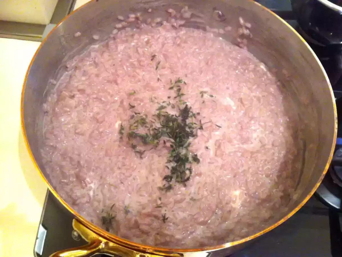 Risotto con vino rosso, crescenza e timo