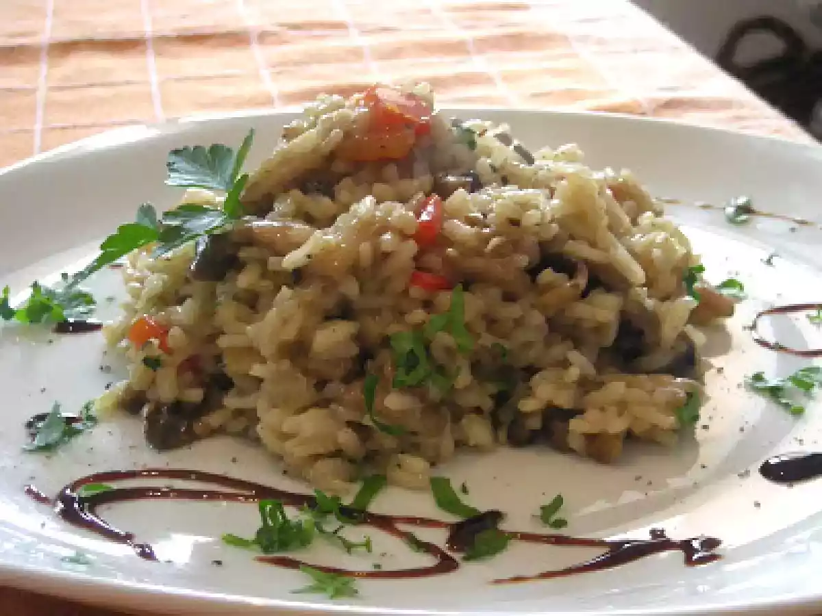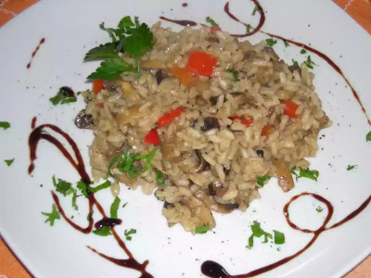 Risotto "funghi e peperoni" di hermes PrecedenteProssimo Portata principalefacile18 min Invia questa ricetta ad un amico Stampa la ricetta Contatta l'autore della Ricetta Pubblica la foto di questa ricetta Si può mettere anche carni. Ingredienti 2 1 casseruola larga e bassa 1 padella 1 pentolino per brodo 180 g di riso "originario" 400 g di funghi 1 peperone rosso non troppo grande 1 bella cipolla bianca 1 spicchio d'aglio olio extra vergine d'oliva ½ dado ai funghi porcini 10 g funghi porcini secchi ¼ di bicchiere di vino bianco noce di burro prezzemolo fresco (tritato con il coltello) aceto balsamico alle mele sale, pepe peperoncino tritato