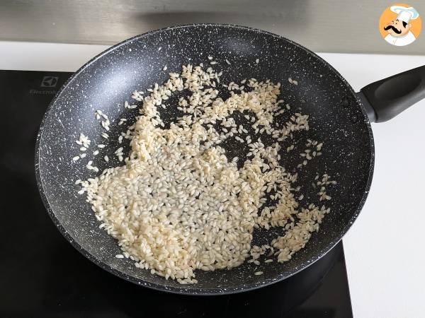 Sminuzzate la cipolla finemente e soffriggetela in padella con una noce di burro. Poi aggiungete il riso e tostatelo per un paio di minuti mescolando spesso.