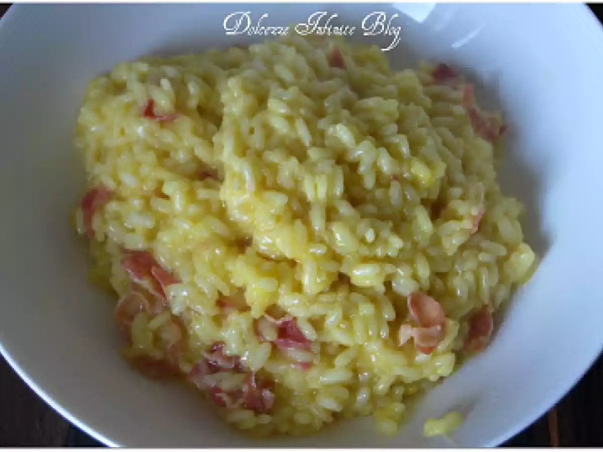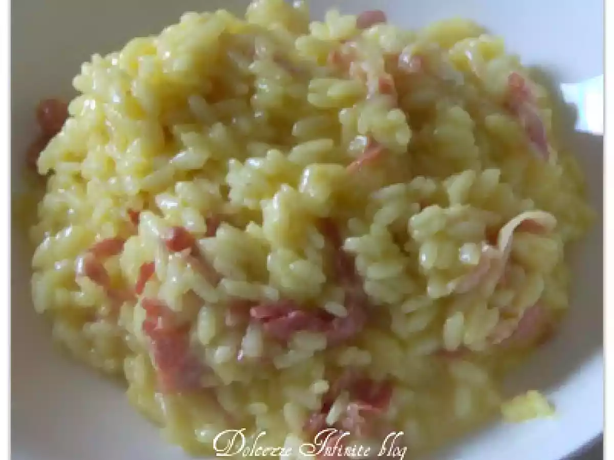 Risotto pancetta e zafferano PrecedenteProssimo Portata principalefacile45 min683 Kcal Invia questa ricetta ad un amico Stampa la ricetta Contatta l'autore della Ricetta Pubblica la foto di questa ricetta Ingredienti 4 400 g di riso per risotti 1/ 2 cipolla 100 g di pancetta tagliata a fettine e tagliuzzata 1/2 bicchiere di vino bianco secco 1 l di brodo vegetale 50 g di burro 3 cucchiai di grana grattugiata 2 cucchiai di olio extravergine di oliva una bustina di zafferano un trito di prezzemolo sale e pepe Costo stimato: 7.34Euros€ (1.83€/Porzioni)