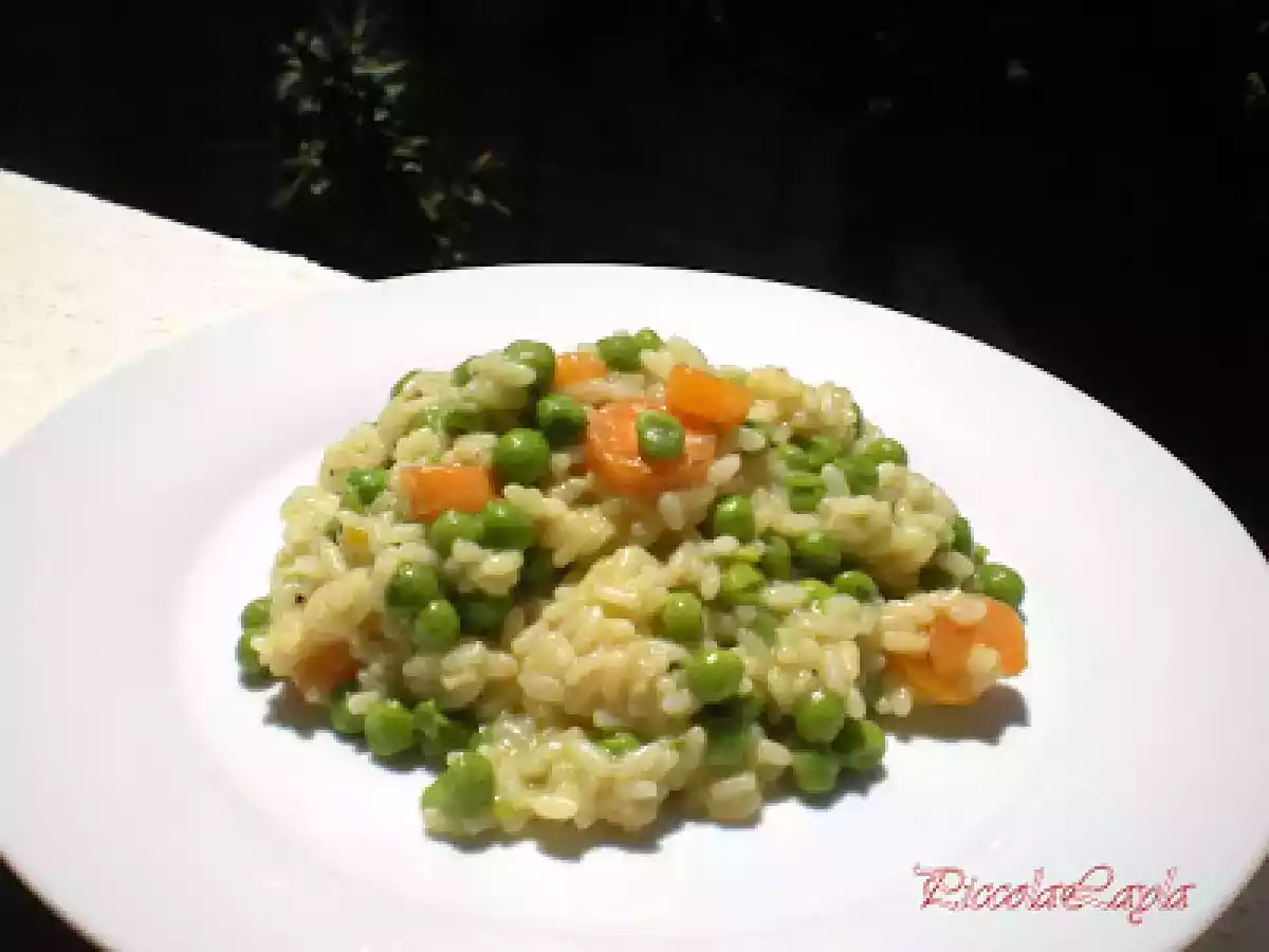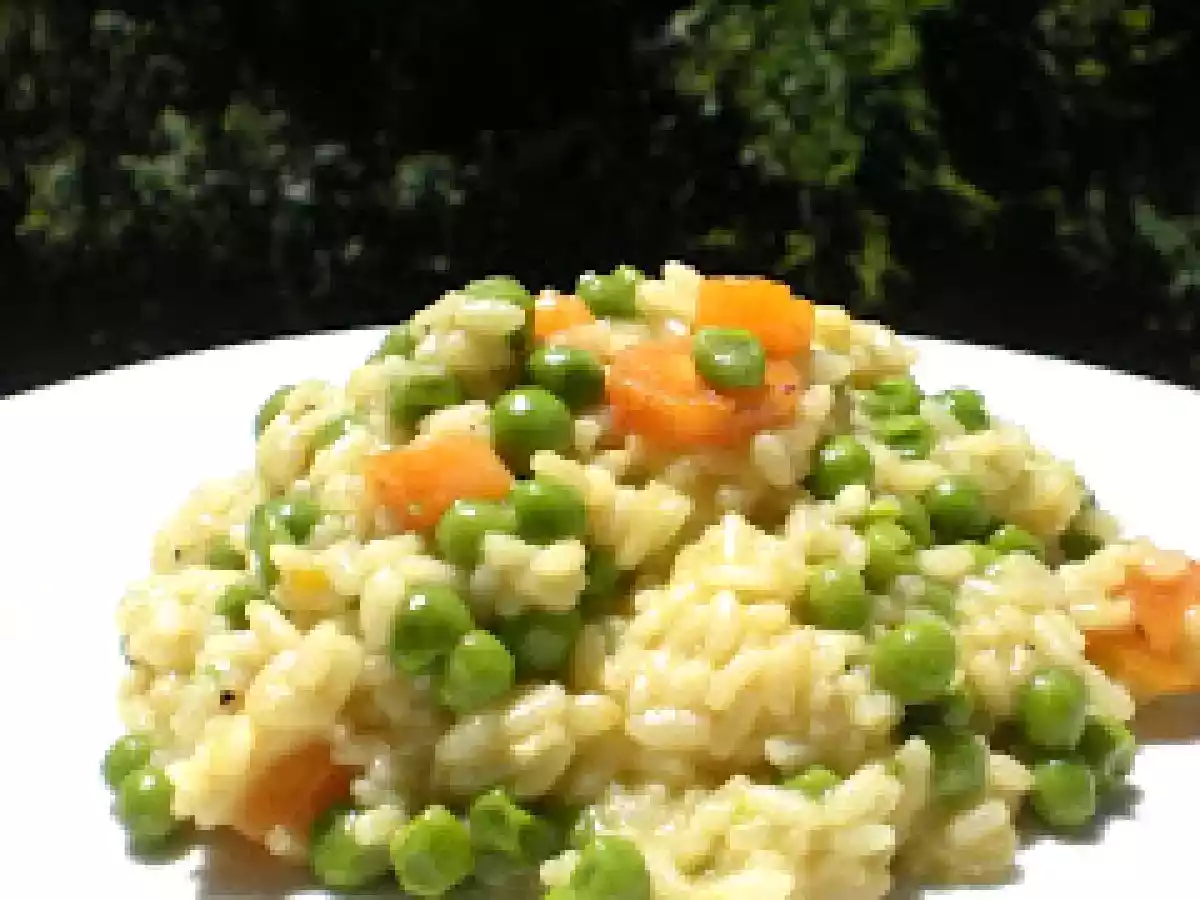 Risotto primavera vegetariano PrecedenteProssimo Portata principalefacile35 min1014 Kcal Invia questa ricetta ad un amico Stampa la ricetta Contatta l'autore della Ricetta Pubblica la foto di questa ricetta Ingredienti 2 300 g di riso per risotti 4 carote 1 cipolla bianca 200 g di piselli 1 cucchiaio di dado 1/ 2 bicchiere di vino prezzemolo sale pepe olio extravergine di oliva burro formaggio grattugiao Costo stimato: 4.85Euros€ (2.42€/Porzioni)