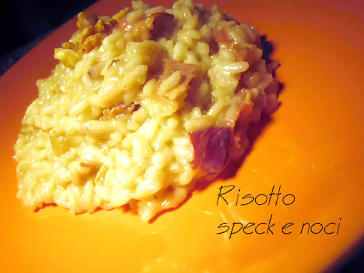 Risotto speck e noci Portata principalefacile35 min Invia questa ricetta ad un amico Stampa la ricetta Contatta l'autore della Ricetta Pubblica la foto di questa ricetta Ingredienti 2 100 g di riso 4 o 5 fette di speck 6 o 7 noci 1 scalogno formaggio fresco spalmabile brodo vegetale formaggio grana olio evo sale