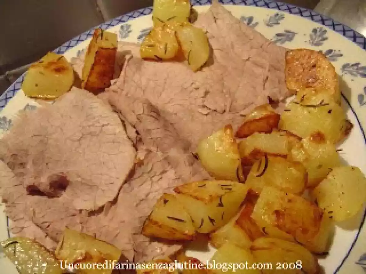 Roast beef (quasi all'inglese) e patate PrecedenteProssimo Portata principalefacile1 h 5 m Invia questa ricetta ad un amico Stampa la ricetta Contatta l'autore della Ricetta Pubblica la foto di questa ricetta Ingredienti 4 1) 1 kg di controfiletto di manzo 3 cucchiai di olio burro a piacere sale e pepe qualche cucchiaio di brodo di carne 2) 1 kg di patate 3 cucchiai di olio tre rametti di rosmarino freschi sale e pepe