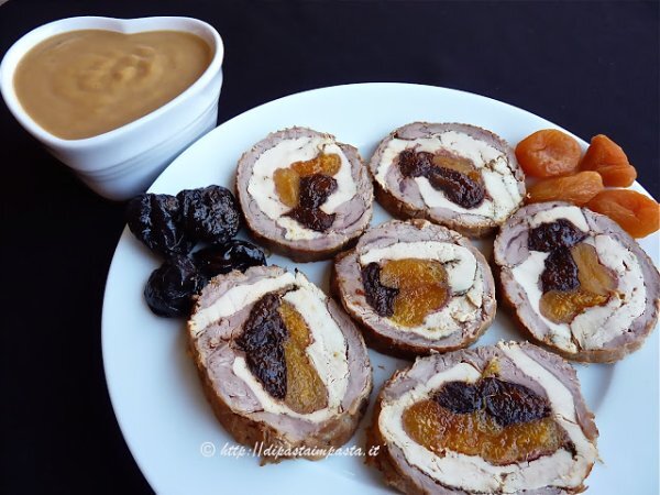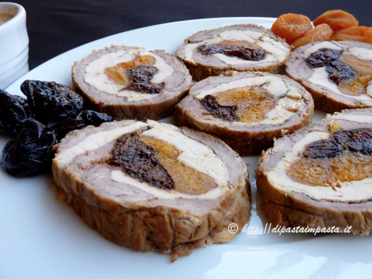 Rollè di vitello e pollo con albicocche e prugne secche PrecedenteProssimo Portata principalefacile40 min Invia questa ricetta ad un amico Stampa la ricetta Contatta l'autore della Ricetta Pubblica la foto di questa ricetta Ingredienti 4 800 g di rollè di vitello 1 petto di pollo 2/3 fette di prosciutto crudo 8 albicocche secche + 3 per la salsa 8 prugne secche 2 cipolle 1 bicchiere di vino bianco 1 bicchiere di brodo vegetale olio evo rosmarino sale e pepe