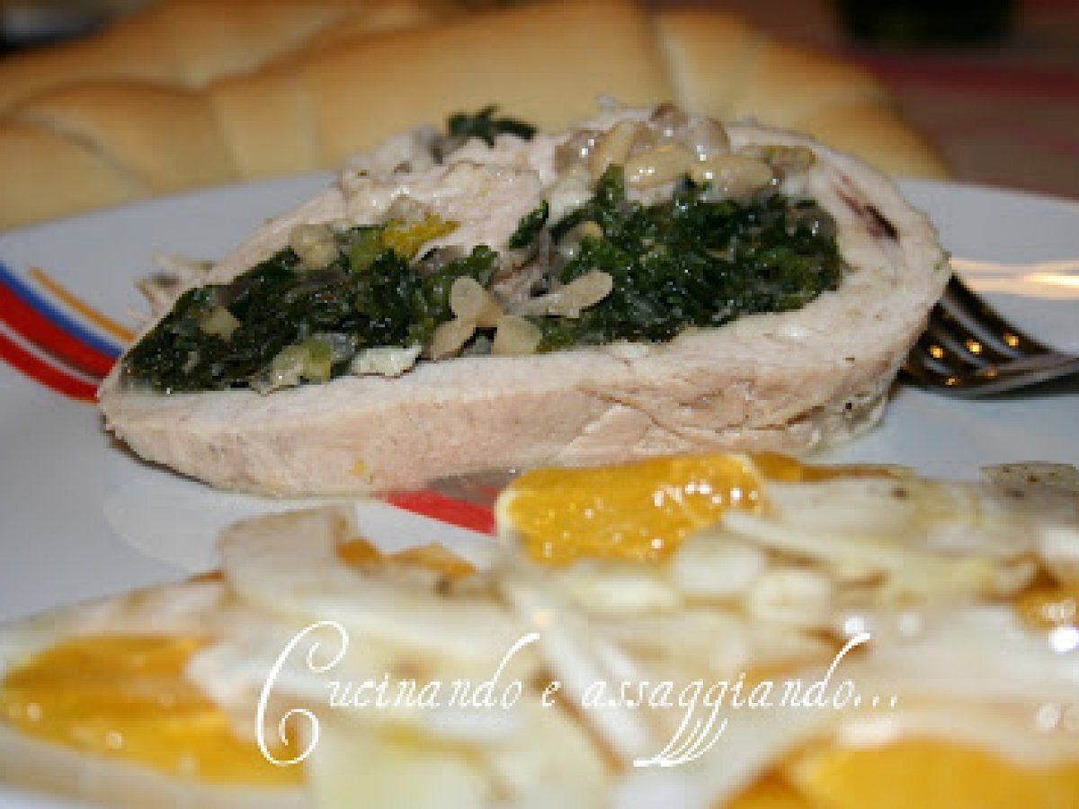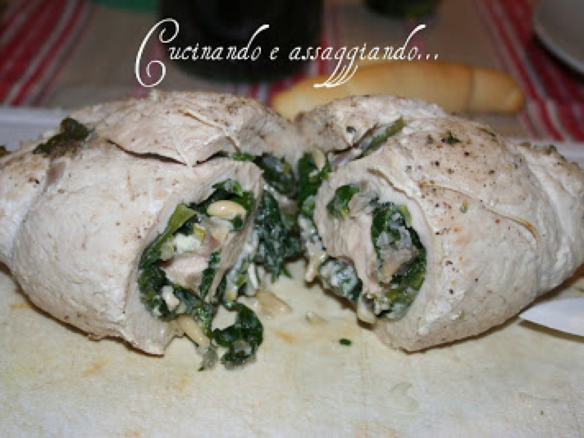 Rotolo di tacchino con spinaci, pinoli e gorgonzola vota adesso PrecedenteProssimo Portata principalefacile1 h 15 m255 Kcal Invia questa ricetta ad un amico Stampa la ricetta Contatta l'autore della Ricetta Pubblica la foto di questa ricetta Ingredienti 8 800 g di polpa di tacchino in una sola fetta 300 g di spinaci 50 g di pinoli 2 cucchiai di olio extravergine di oliva 1 cipolla 1 spicchio d'aglio 100 g di gorgonzola dolce sale e pepe Costo stimato: 11.77Euros€ (1.47€/Porzioni)