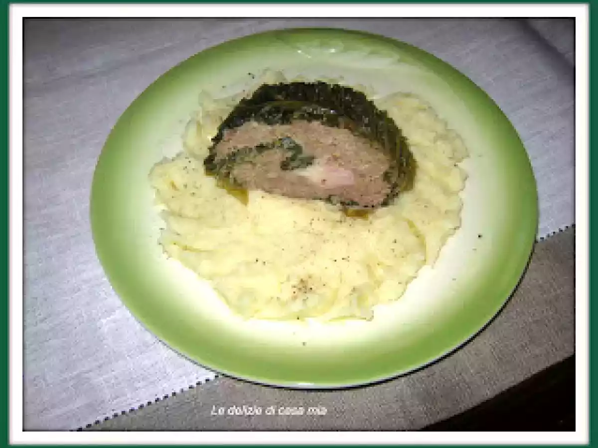Rotolo di verza ripieno con carne trita spolverato al maiorchino. Portata principalefacile55 min Invia questa ricetta ad un amico Stampa la ricetta Contatta l'autore della Ricetta Pubblica la foto di questa ricetta Ingredienti 6 10 foglie di cavolo verza 400 gr di carne trita pepe nero dell'Ariosto, 1 uovo 50 gr di Maiorchino o altro formaggio da grattugia pangrattato,formaggio filante a pezzetti 4 fette di prosciutto cotto. Pure: 5 Patate bollite latte q.b pepe nero e noce moscata e una noce di burro salato Fattorie Fiandino.
