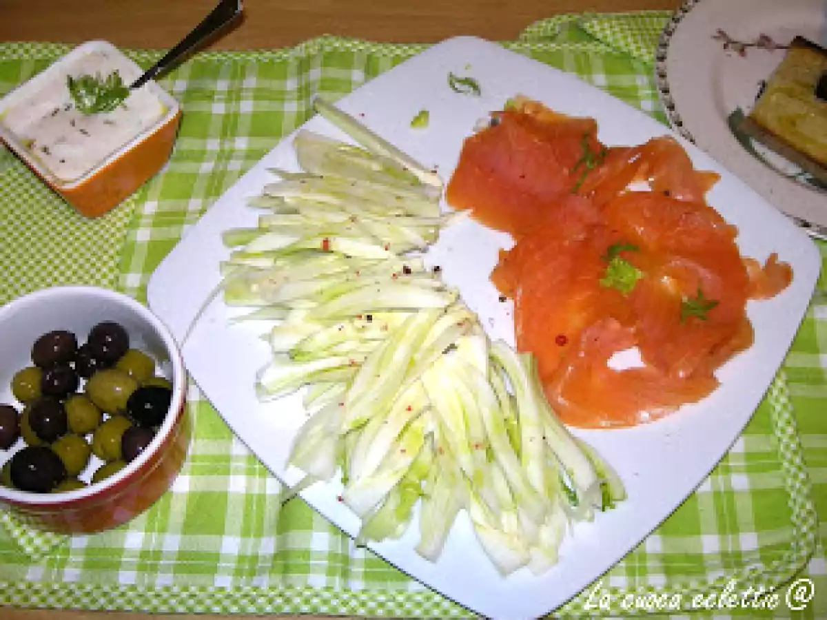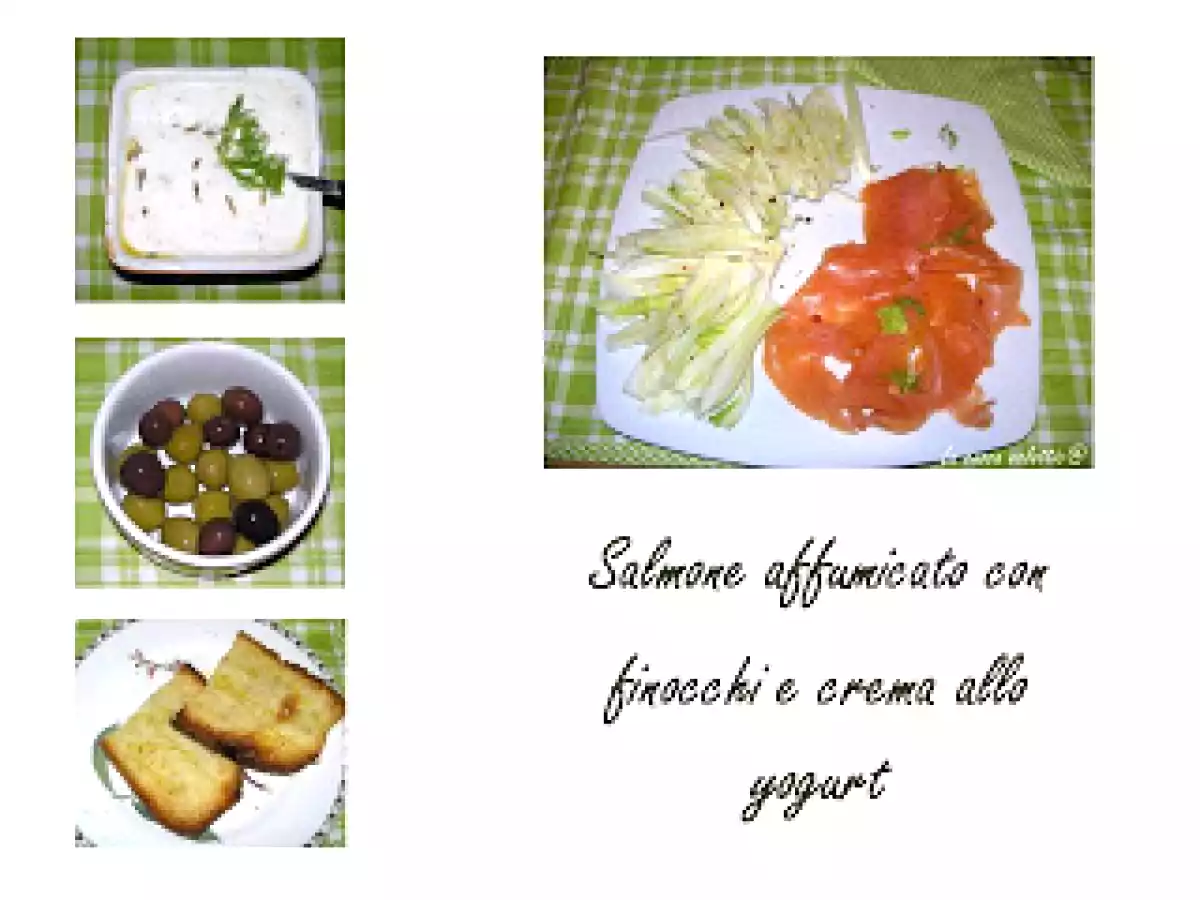 Salmone affumicato con finocchi e crema allo yogurt vota adesso PrecedenteProssimo Portata principalefacile45 min Invia questa ricetta ad un amico Stampa la ricetta Contatta l'autore della Ricetta Pubblica la foto di questa ricetta Ingredienti 4 100 g di salmone affumicato 2 finocchi medi 125 g di yogurt bianco olive verdi olive nere 1/2 cucchiaino di semi di finocchio pepe nero,paprica olio extravergine d'oliva