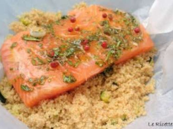 Salmone al cartoccio con cous Portata principalefacile45 min Invia questa ricetta ad un amico Stampa la ricetta Contatta l'autore della Ricetta Pubblica la foto di questa ricetta Ingredienti 2 125 gr di cous cous ai 4 cereali 125 ml di brodo vegetale 2 filetti di salmone, privati della pelle 1 zucchina 3 cipollotti 2 rametti di rosmarino sale, pepe rosa e timo qb 3 cucchiai d'olio evo qb