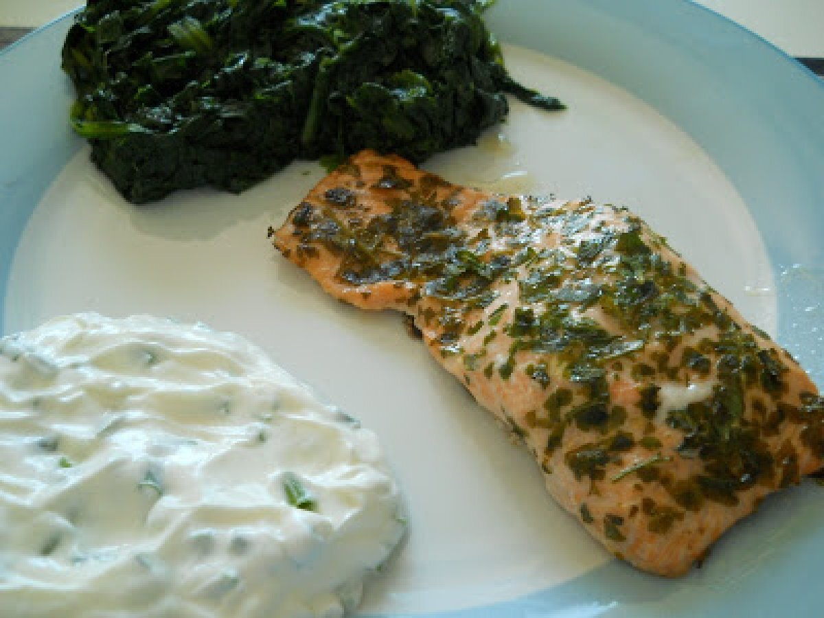 Salmone al forno con salsa yogurt e spinaci saltati al burro salato