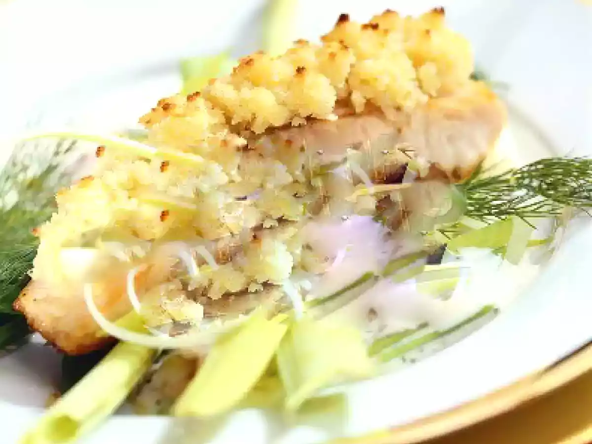 Salmone aromatizzato in crosta di pasta sfoglia Portata principalefacile50 min82 Kcal Invia questa ricetta ad un amico Stampa la ricetta Contatta l'autore della Ricetta Pubblica la foto di questa ricetta Ingredienti 4 pan grattato q.b. a coprire la superficie della fetta un po di cipolla rossa senape rustica un po di timo 2 cucchiai di parmigiano grattugiato olio evo sale Costo stimato: 0.74Euros€ (0.19€/Porzioni)