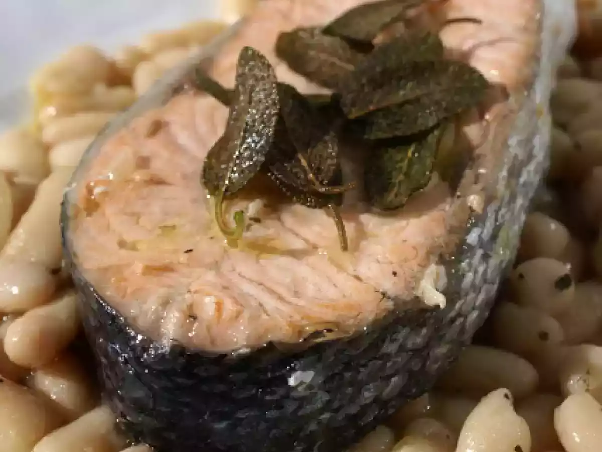 Salmone su letto di fagioli cannellini al profumo di salvia fritta vota adesso Portata principalefacile55 min Invia questa ricetta ad un amico Stampa la ricetta Contatta l'autore della Ricetta Pubblica la foto di questa ricetta Ingredienti 5 trancio di salmone olio sale pepe aglio fagioli cannellini ( già cotti) erbe aromatiche ( timo, origano, maggiorana...) piccole foglie di salvia o foglie grandi fatte a striscioline