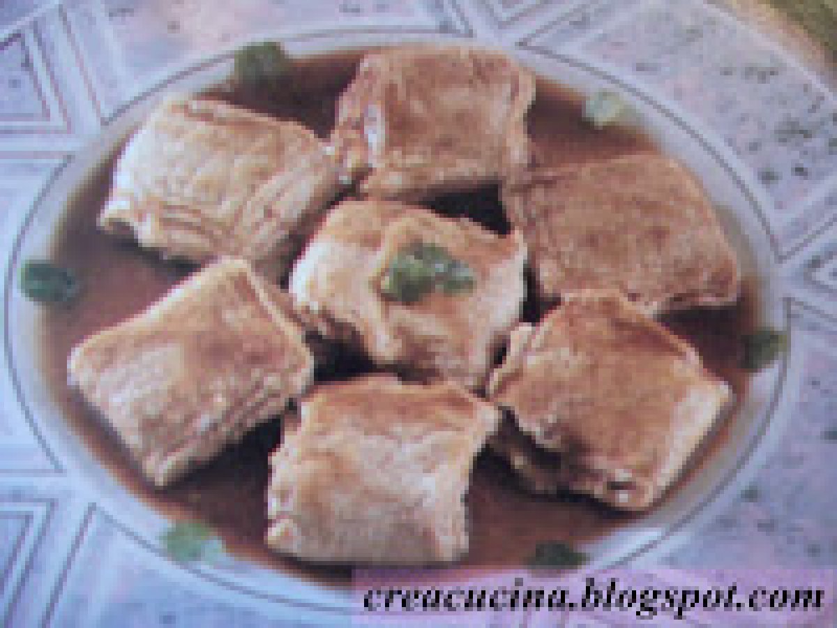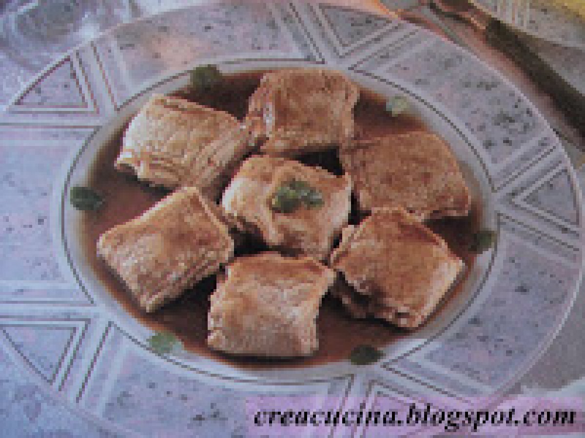 - Battete le fettine di vitello e tagliatele in rettangoli. Su ciascuna disponete un po' di prosciutto cotto, qualche scaglia di parmigiano, una fogliolina di salvia, un pizzico di sale e pepe, chiudete le estremità con uno stecchino e infarinatele leggermente.