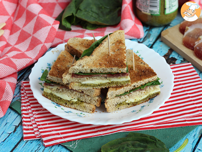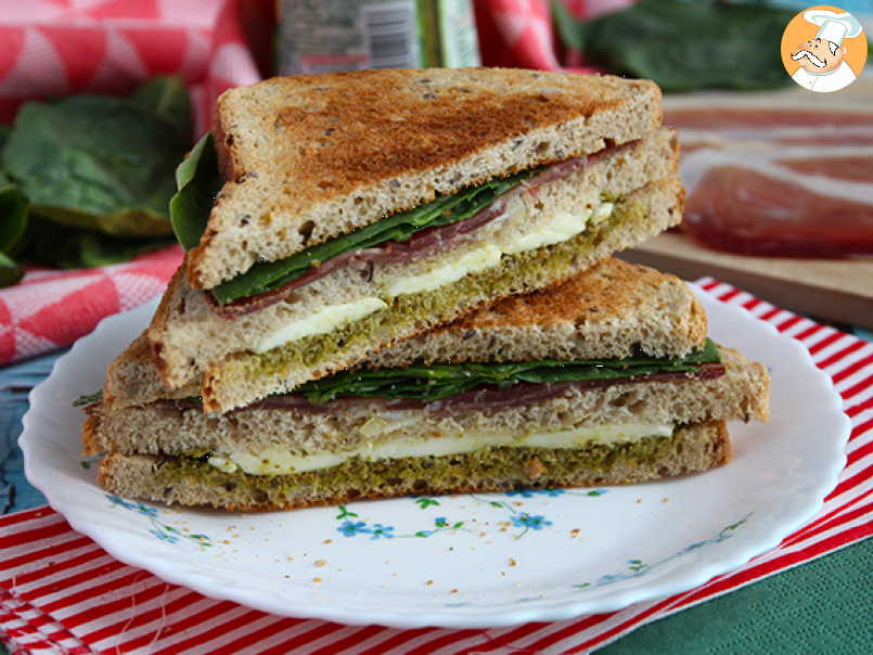Gli ingredienti principali sono pancarrè ai cereali, prosciutto crudo, mozzarella, pesto e spinaci freschi.