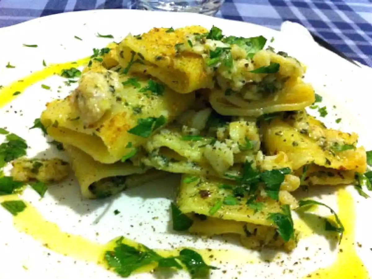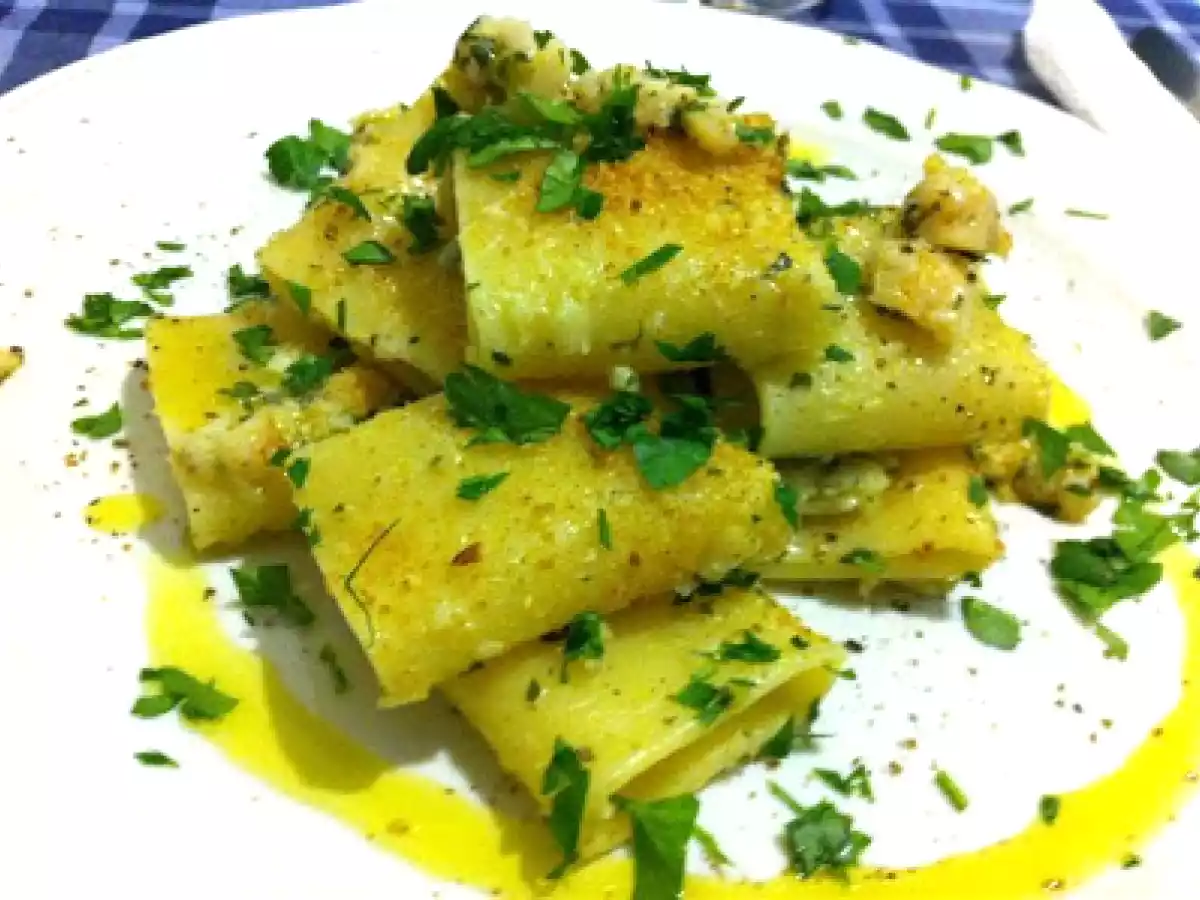 - Tornate al pesce e sfumatelo con del vino bianco secco, sfumato con della grappa affinata in botti Porto. Fate evaporare e spegnete la fiamma. In una pentola portate ad ebollizione dell'acqua salata e versate gli schiaffoni.